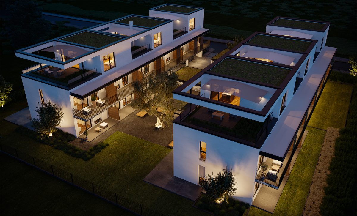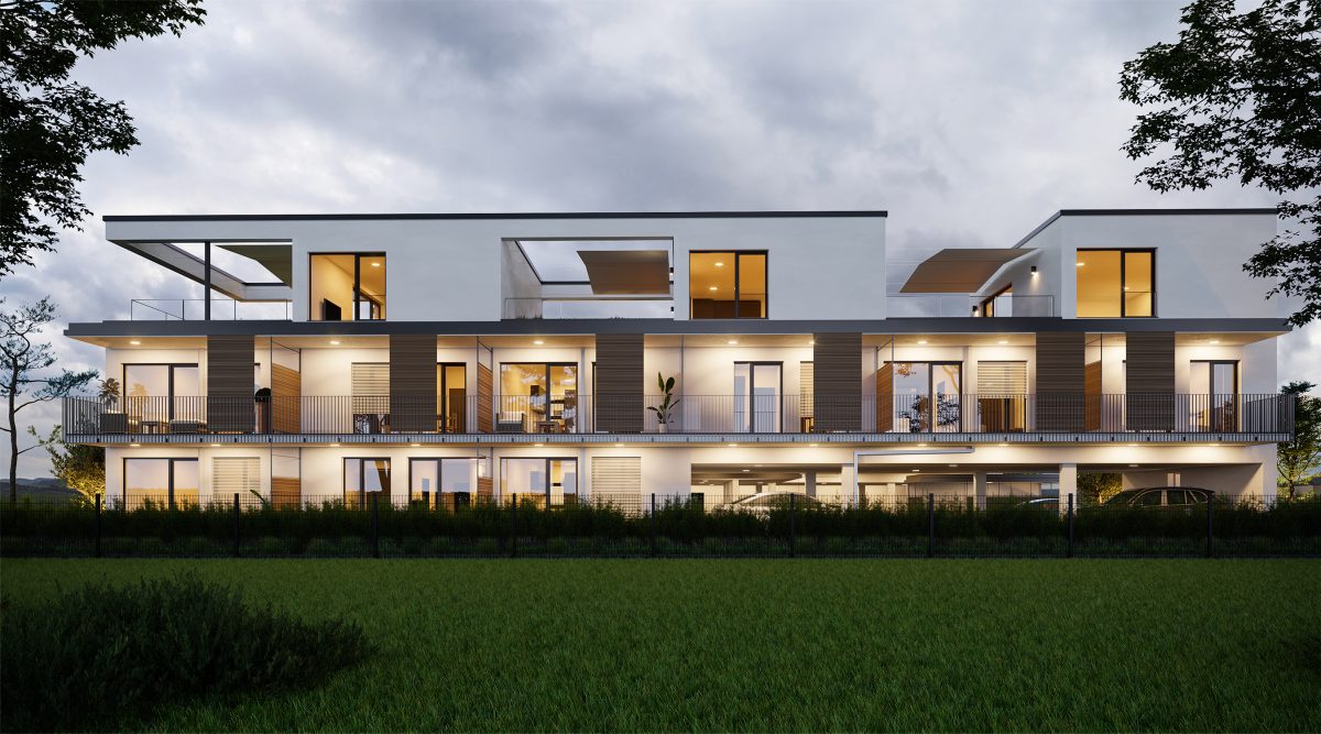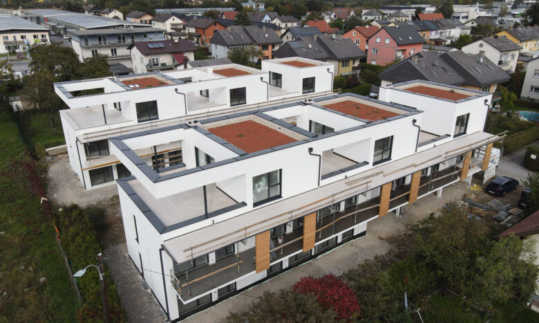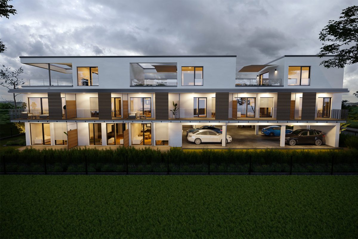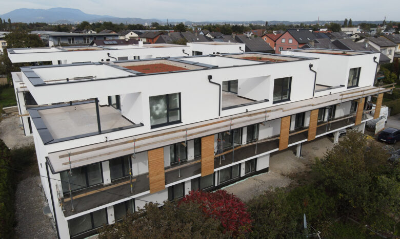Die beiden Wohngebäude werden in Ziegelmassivbauweise, sowohl innen als auch außen, errichtet, und haben einerseits einen Wohnungstyp mit zwei Zimmern und andererseits einen Wohnungstyp mit 3 Zimmern zu bieten. Die 3-Zimmer-Wohnungen sind auf zwei Geschosse im Sinne einer Maisonette-Wohnung aufgeteilt, und können aufgrund der großen Dach-Terrasse und dem daraus resultierenden Penthouse-Charakter vollends glänzen. Darüber hinaus sind großzügige Balkonflächen nicht nur bei den Maisonette-, sondern auch bei den kleinen Wohnungen enthalten. Die jeweils drei im Erdgeschoss positionierten Wohnungen offerieren neben einer gemütlichen Terrasse auch einen eigenen Garten. Gebäudeintegrierte Parkmöglichkeiten sind jeder Wohnung zugeteilt, sowie auch geräumige Kellerabteile.