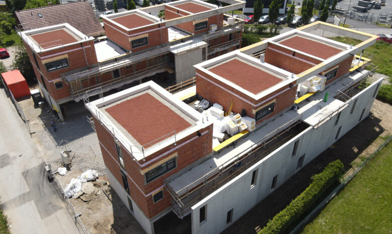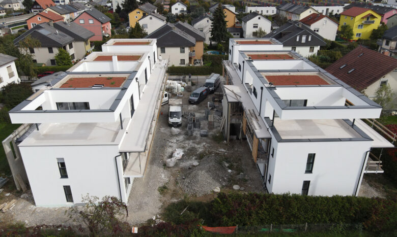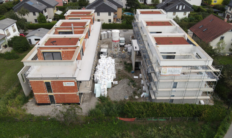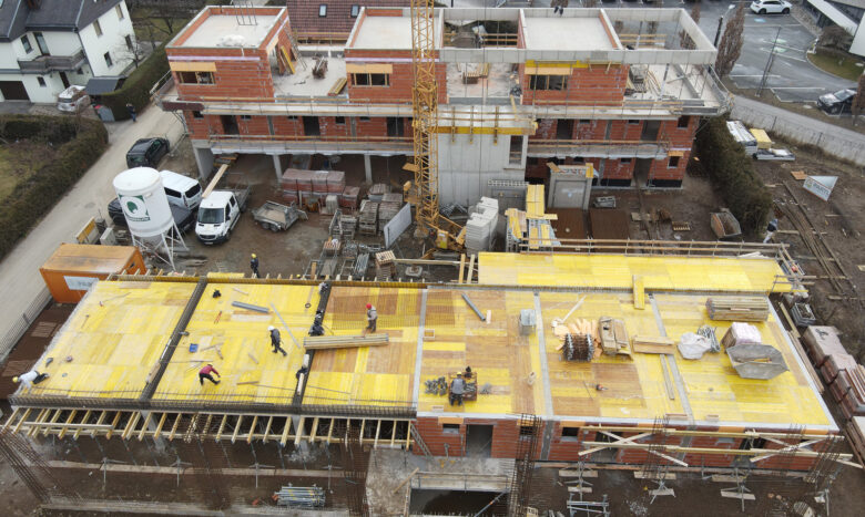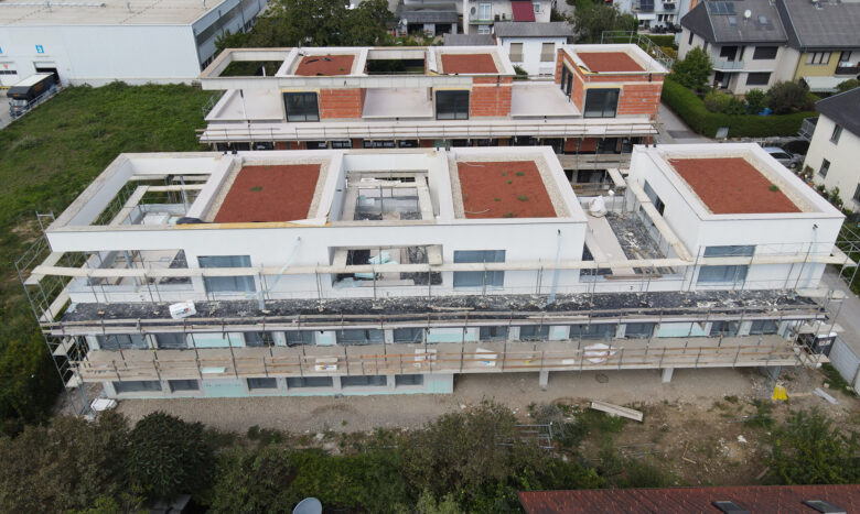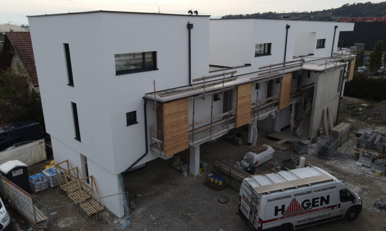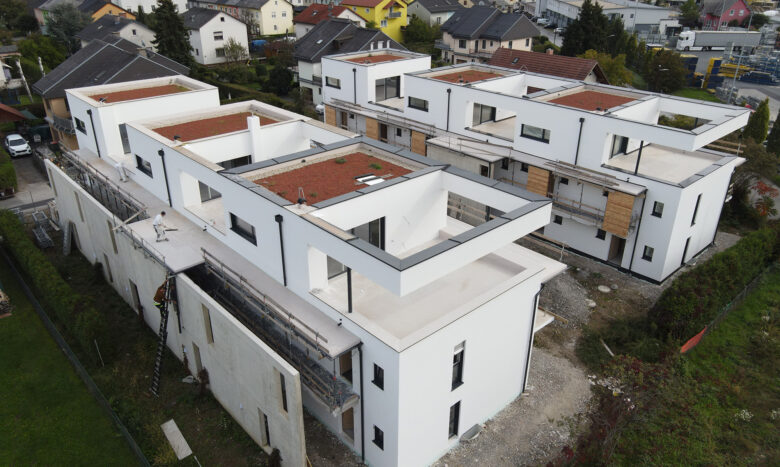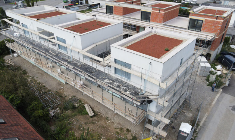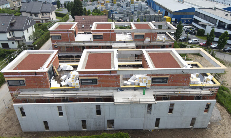 Beim vorliegenden Projekt wurden die Arbeiten am Rohbau abgeschlossen. Somit steht schon das Grundkonstrukt des Gebäudes. Darüber hinaus wurde auch das Dach abgedichtet.