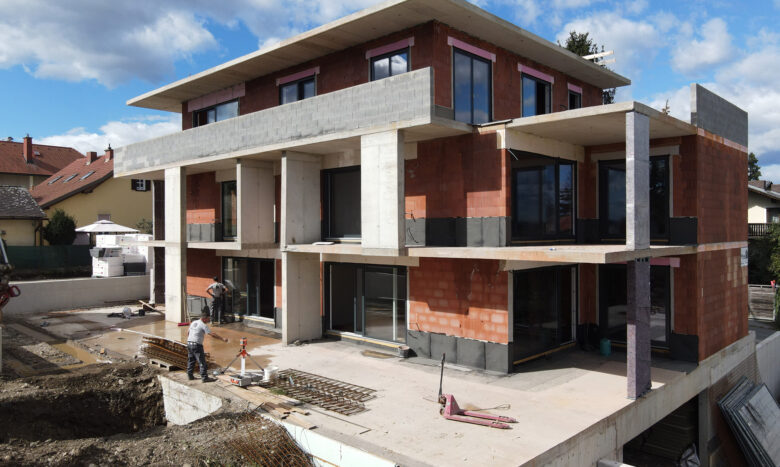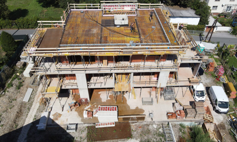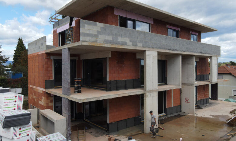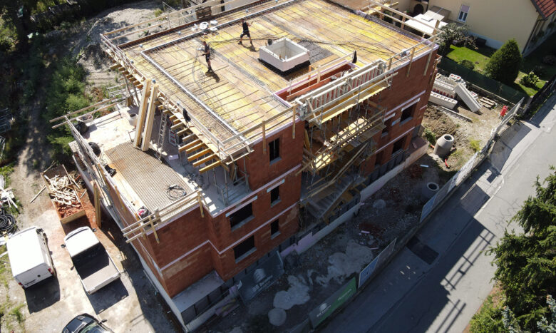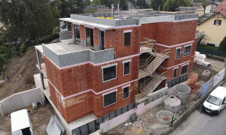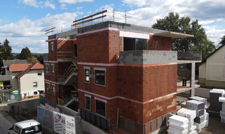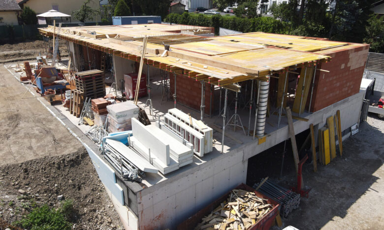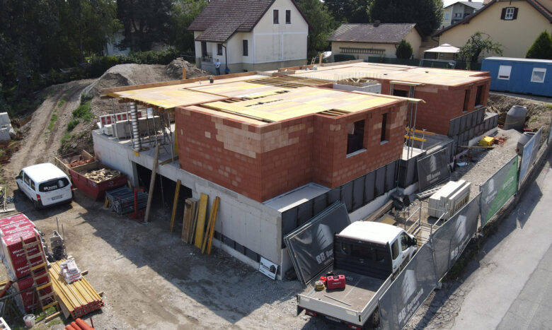 Beim vorliegenden Projekt wurden die Arbeiten am Rohbau abgeschlossen. Somit steht schon das Grundkonstrukt des Gebäudes. Darüber hinaus wurde auch das Dach abgedichtet.
