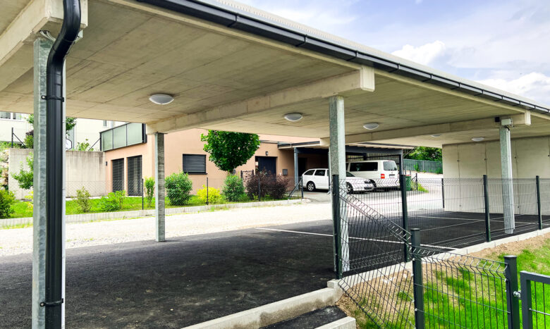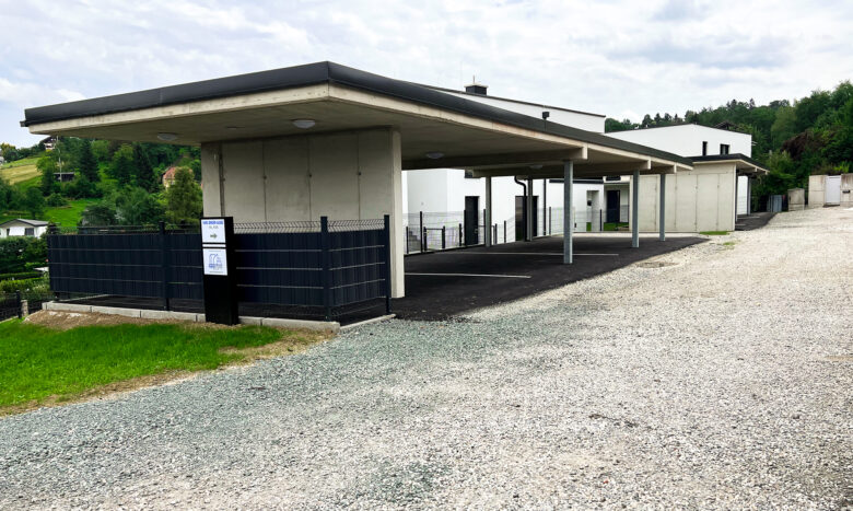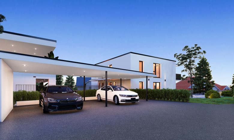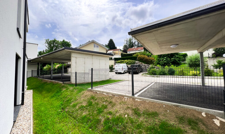 Darüber hinaus gehört jeder Doppelhaushälfte ein Doppelcarport und ein Eigengarten an. Das Grundstück ist rundum völlig eingezäunt.