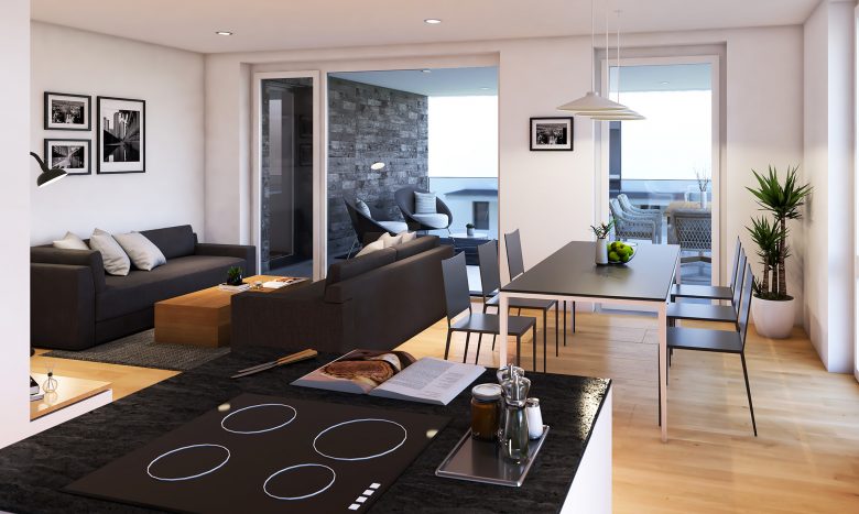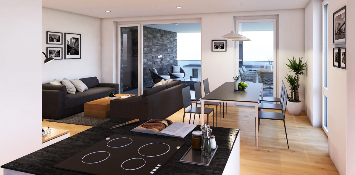 Deutlich macht sich dieses freie Wohngefühl, wenn man aus der Diele kommend entlang der Küche in den knapp 40 m² großen Wohnbereich spaziert. Der Küchenzugang von zwei Seiten unterstreicht dieses entbundene und unbeschwerliche Wohngefühl. Durch die beiden großen Terrassen-Öffnungen ist dem Sonnenlicht ein ganztägiges Eindringen ermöglicht, wobei man dieses ebenso auf der knapp 20 m² großen Terrasse genießen kann. Durch die beiden Stiegen zwischen Wohnbereich und Küche gelangt man sowohl ins Unter- als auch ins Obergeschoss.