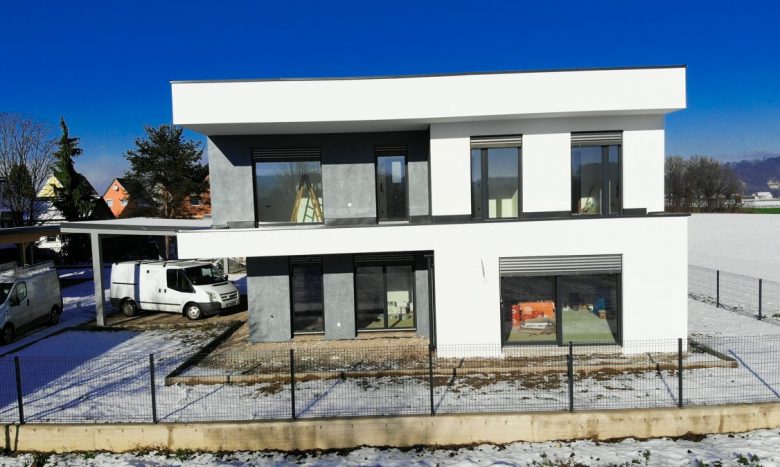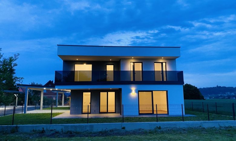 Qualitätsfenster aus Österreich der beliebten Marke JOSKO zieren das gesamte Wohnhaus. Die modernen, außen völlig bündigen, 3-fach-verglasten PVC-Fenster mit Aluschale (innen Weiß, außen Anthrazit) sind natürlich mit elektrisch angetriebenen Raffstore-Rollos ausgestattet. Die Böden sind einerseits mittels Echtholz-Parkett der Marke WEITZER belegt, und andrerseits sind es Großformat-Fliesen, die dem Interieur einen edlen Look verleihen.