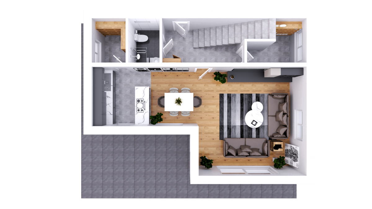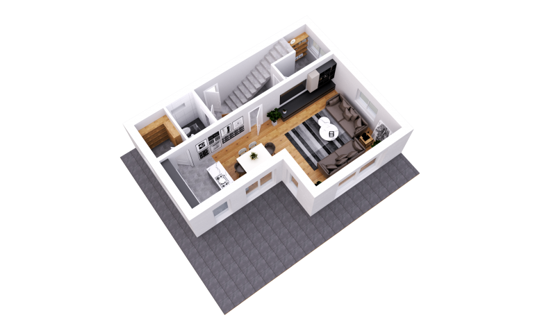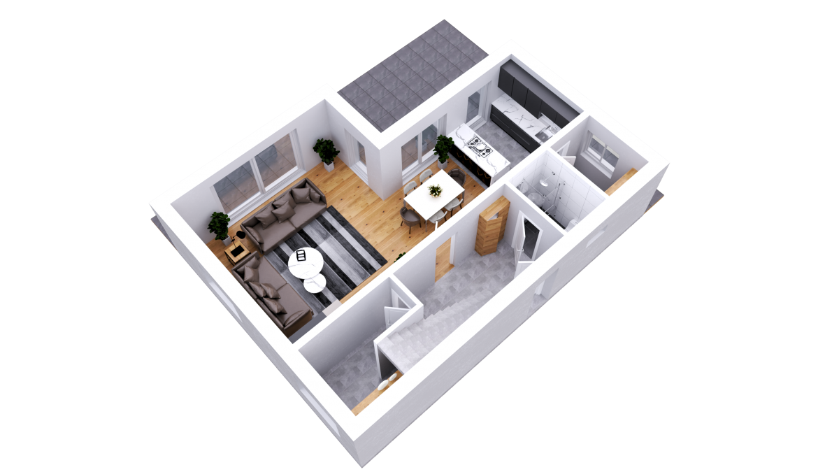 So schreitet man durch die Eingangstür in den großzügigen Vorraum, über den man in alle Räumlichkeiten getrennt eintreten kann. Beispielsweise findet man im Erdgeschoss ein Badezimmer mit Dusche, Handwaschbecken und WC. Ein Technikraum, in dem man neben der Heizungselemente, dem Wasserzähler, dem Stromverteiler auch die Waschmaschine und den Trockner unterbringen kann. Darüber hinaus ist der Raum auch als Kellerersatz gut geeignet. Weitere Abstellmöglichkeiten finden sich ebenso unter der Stiege wieder.