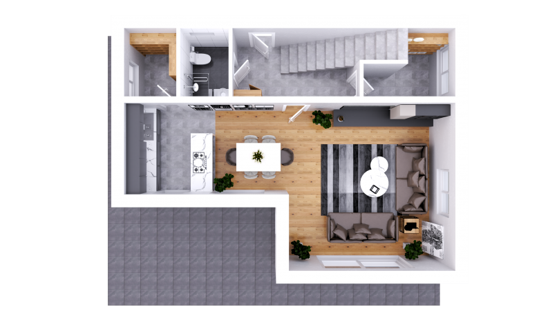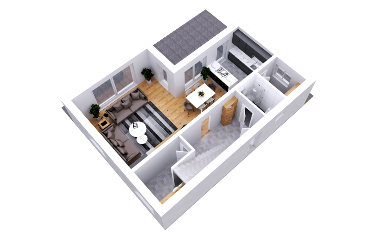 In den lichtdurchfluteten Wohnbereich, der mit stolzen 42 m² glänzt, gelangt man ebenfalls über den Vorraum. Dieser unterteilt sich auf der einen Seite in den Koch- und Essbereich, und auf der anderen Seite in den Wohnbereich. Über die Küchenseite des Raumes gelangt man in eine großräumige Speis, die für Vorräte, Getränke und Küchenutensilien angedacht ist. Der gesamte Wohnbereich ist durch seine Mehrzahl an großen Fensteröffnungen mit Sonnenlicht versorgt. Über die 3 m breite Öffnung, die mit einer Hebeschiebetür ausgestattet ist, gelangt man auf die rund 30 m² große Terrasse. Der Ausgang auf die Terrasse ist aber auch über den Essbereich gegeben.