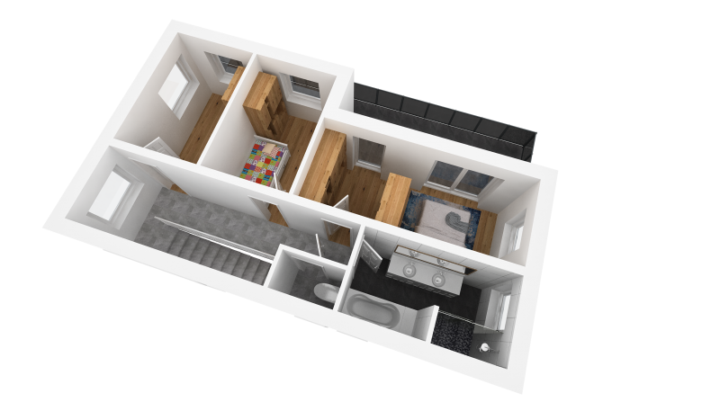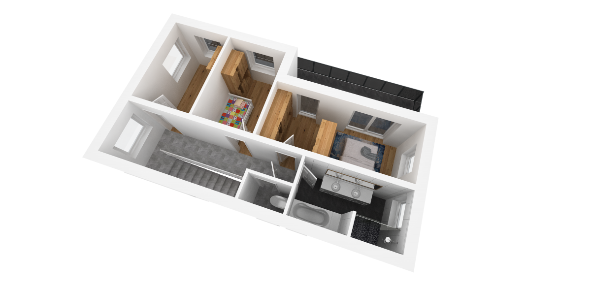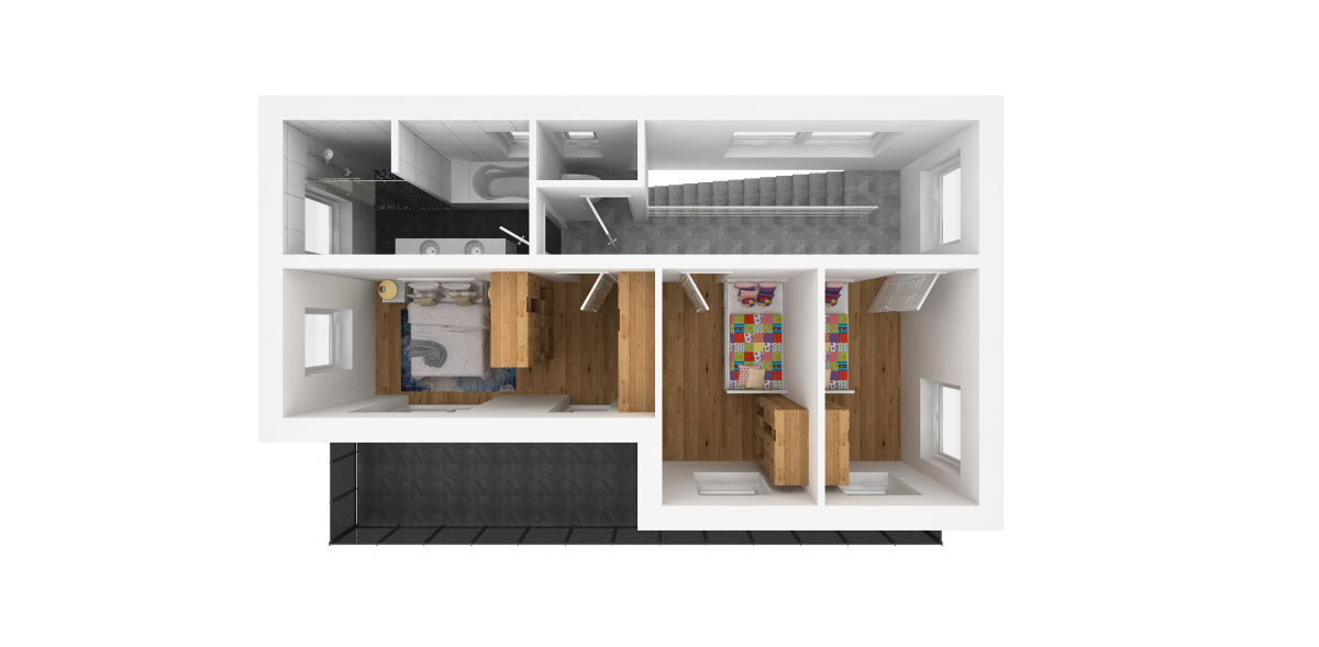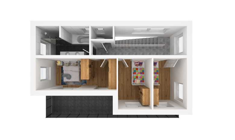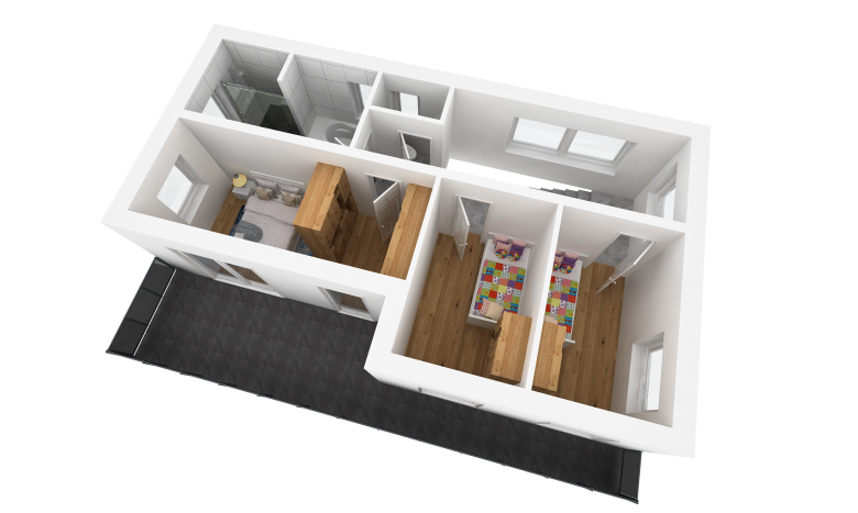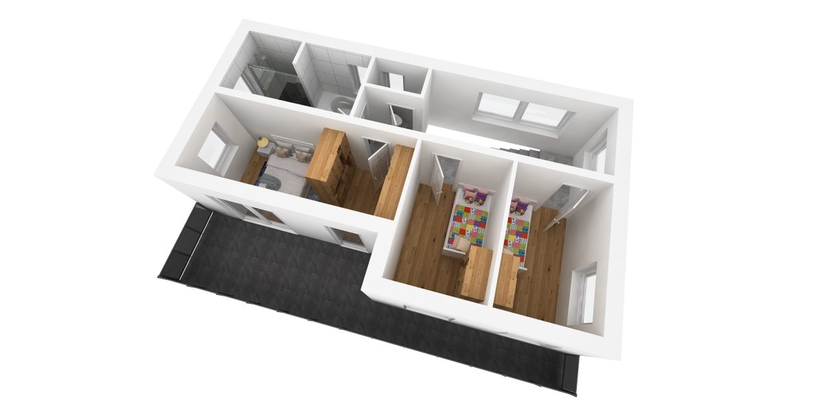 Getrennt, über den Vorraum, gelangt man auch in 3 Schlafzimmern. Darunter zählt das Eltern-Schlafzimmer, welches mit seinen 15 m² punktet, und ebenso durch die Ausrichtung der Betten Richtung Balkon seine Vorzüge hat. Der Zugang zum großzügigen Balkon mit rund 20 m² ist auch übers Eltern-Schlafzimmer gegeben. Weiteres sind die beiden jeweils 10 m² großen Kinderzimmer, über die man jeweils auch auf den Balkon gelangt, auf derselben Etage vorzufinden.
