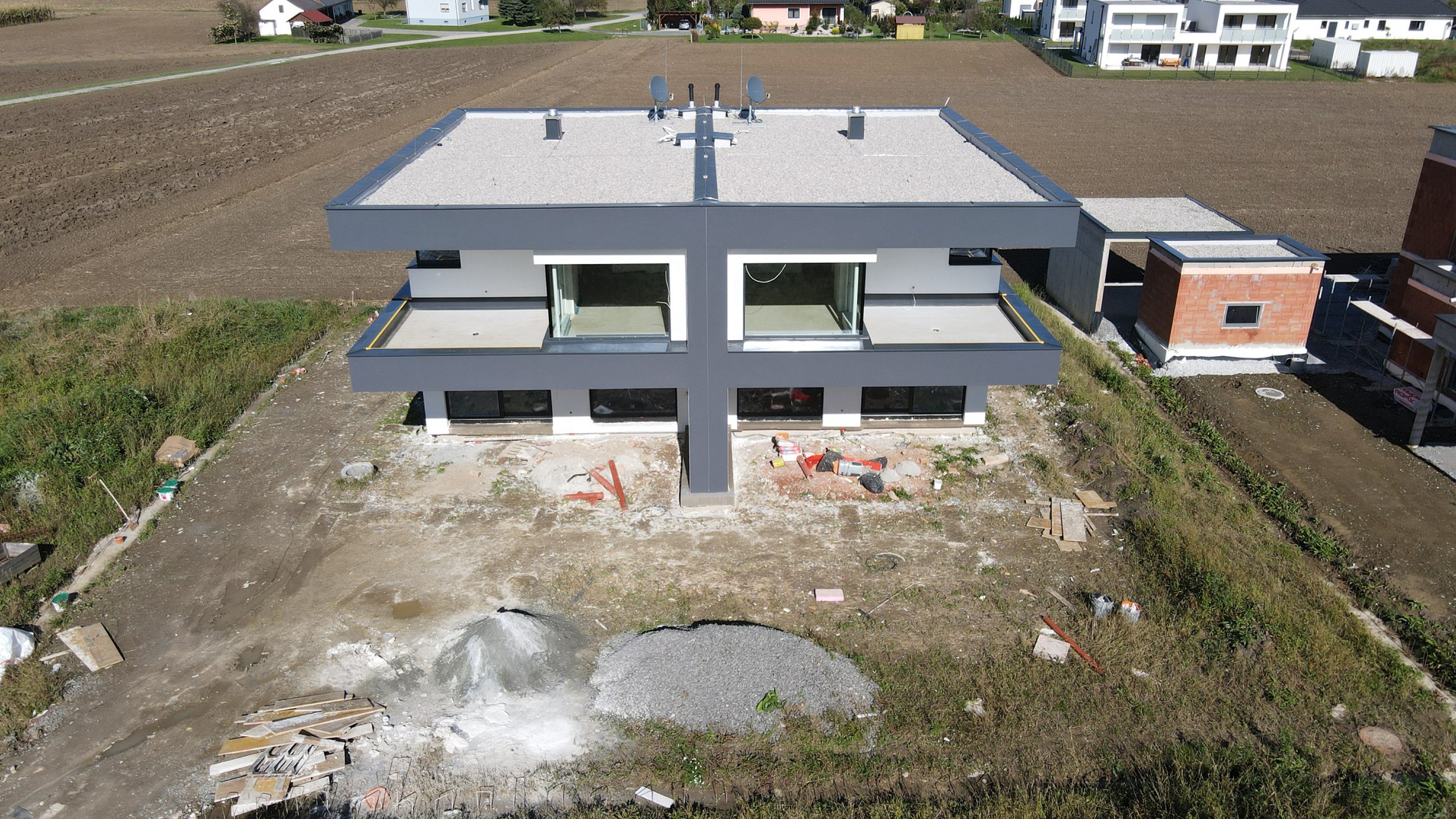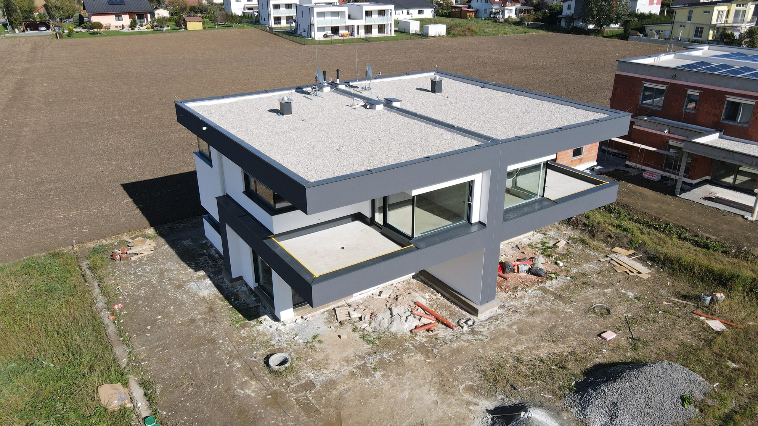 Wir nähern uns langsam, aber ziemlich sicher, der Fertigstellungsphase bei unserem Projekt im Hinterdorfweg 104 in Dobl – Muttendorf. Gerade noch vor der Regenphase konnten unsere Fassadenprofis den Rohbau in sein edles Gewand einhüllen und somit die Fassade abschließen.
