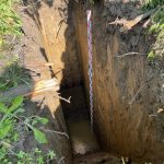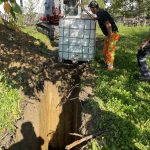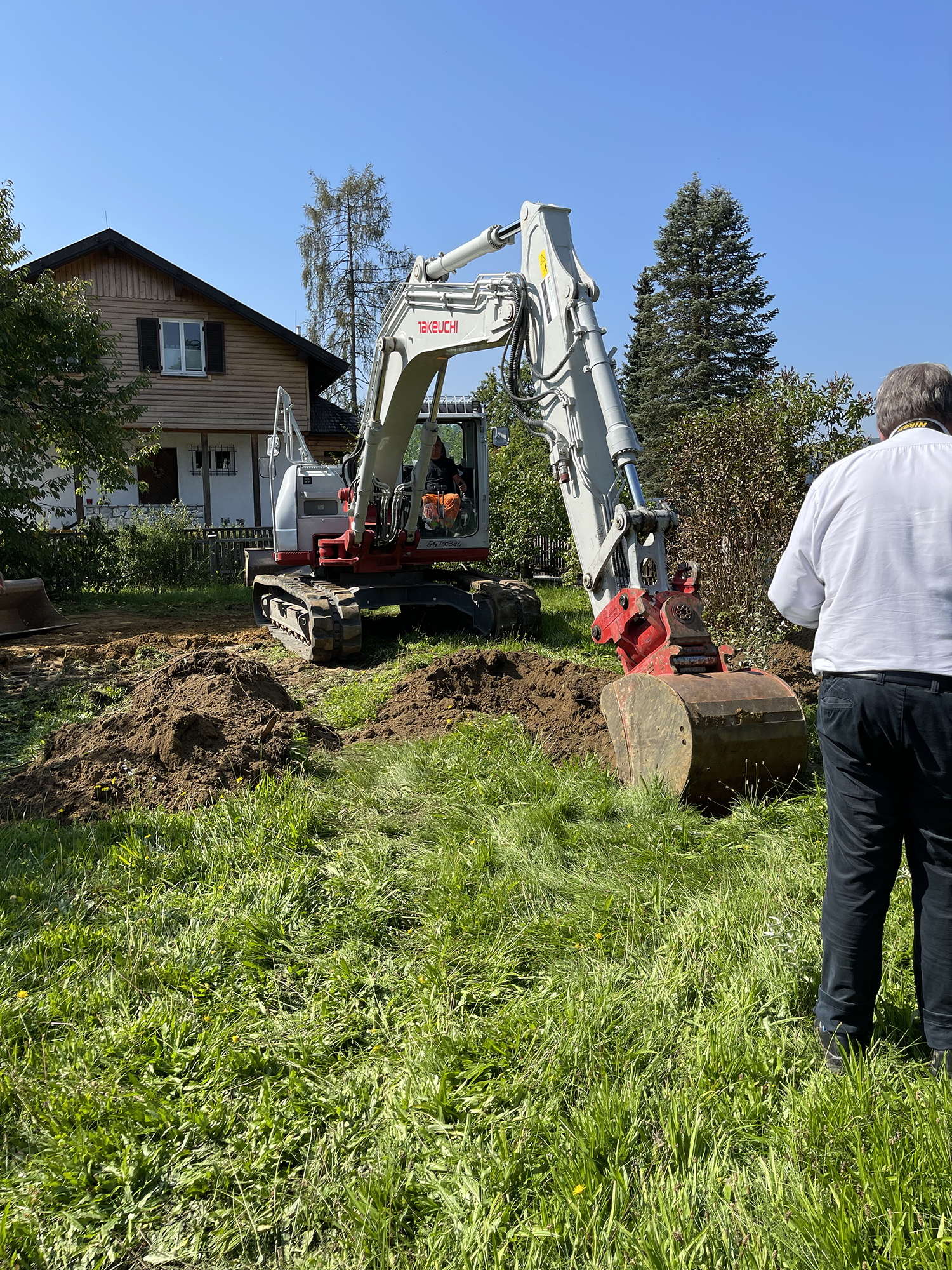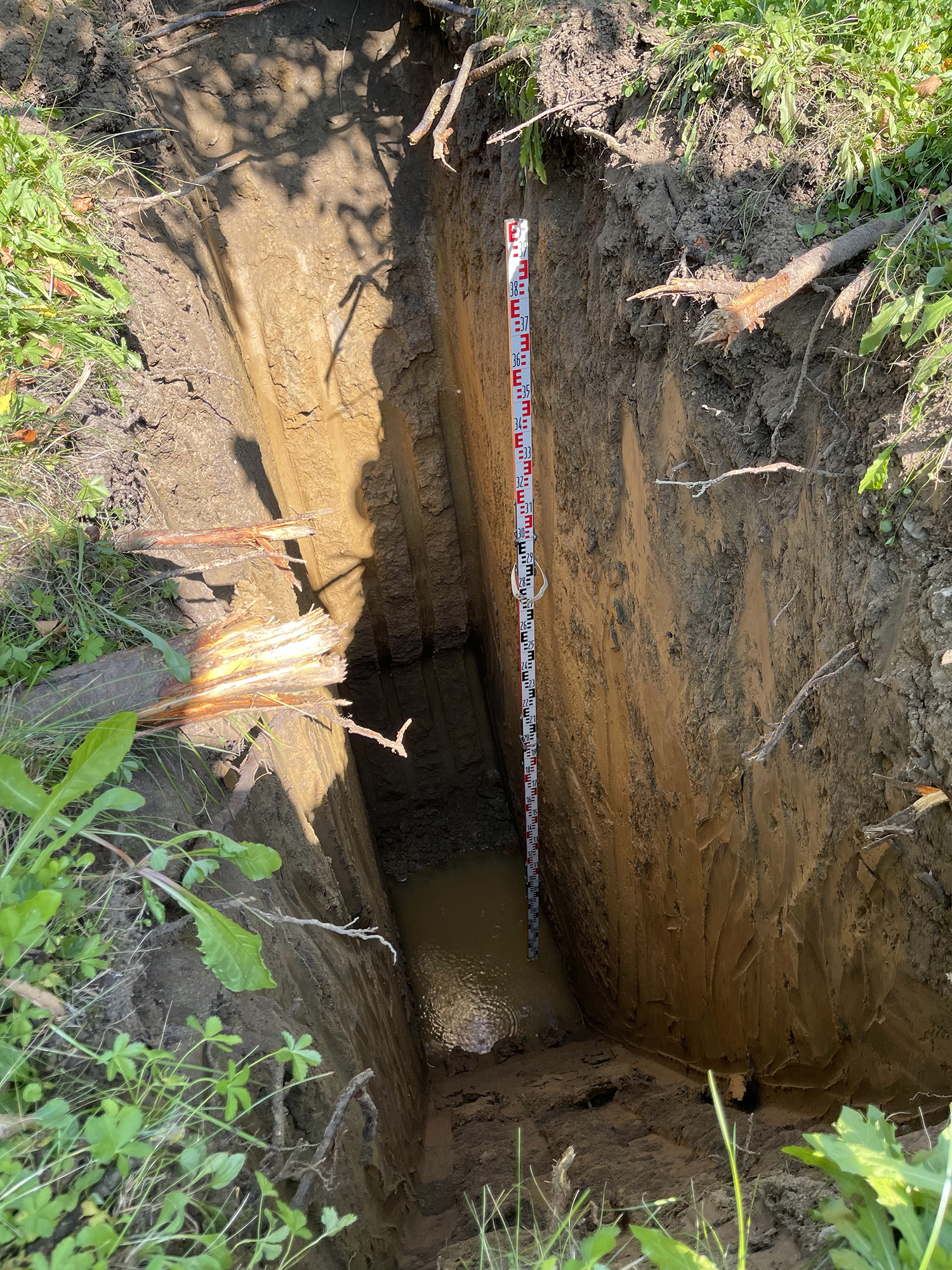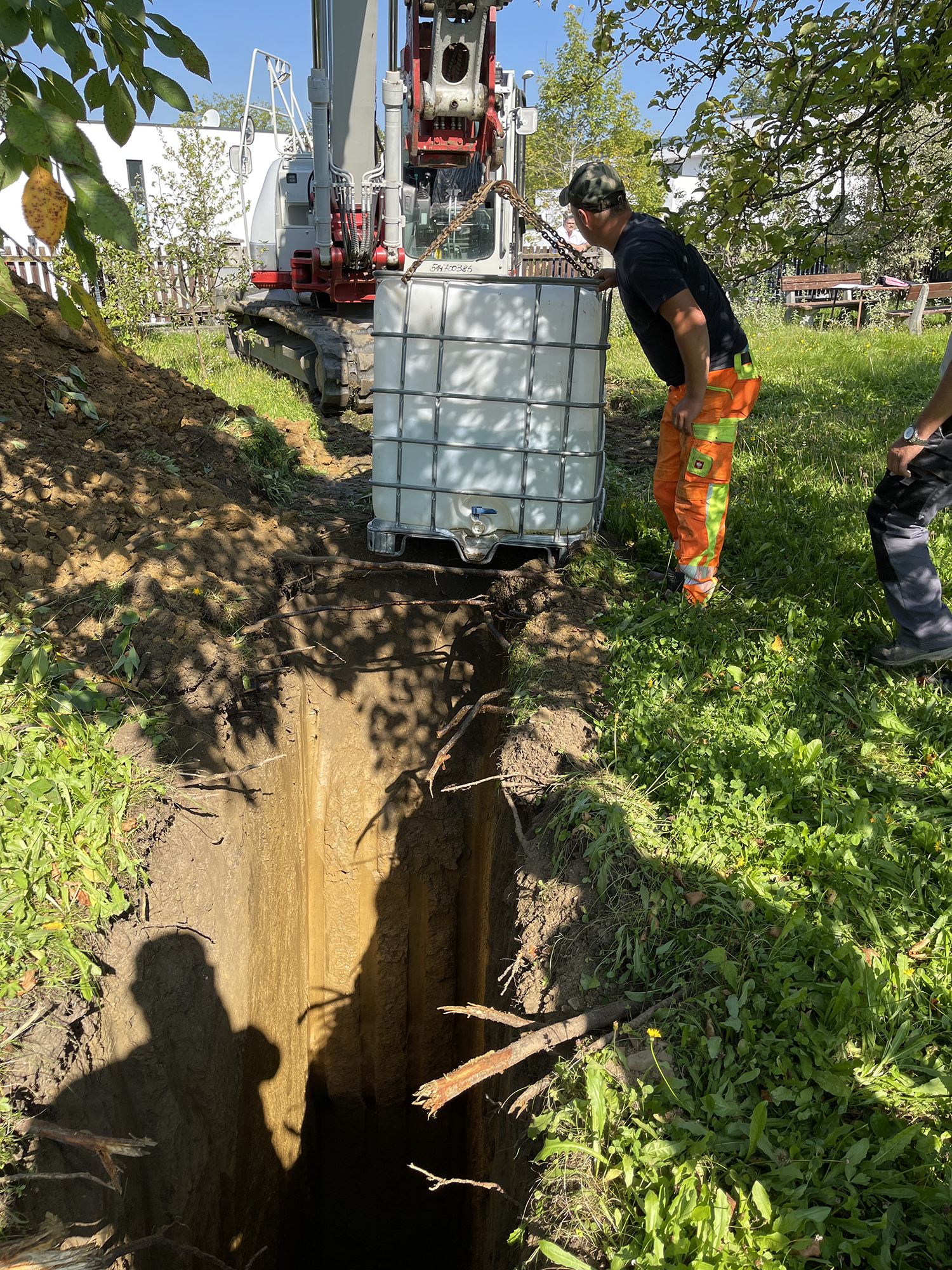 Begleitet durch einen Sachverständigen ist ein 25-Tonnen-Bagger ausgefahren, der für uns ein paar Schlitze ausgegraben hat. Nachdem hier eine Tiefgarage entstehen wird, war es vonnöten, dass wir eine Tiefe von mindestens 5 m erreichen. Dadurch sind einerseits bereits diverse Erdschichten zu sehen, und es zeigt sich auch, wie hoch der Grundwasserspiegel liegt. Mit dem Grundwasser hat man es in dieser Gegend in dieser Tiefe noch nicht wirklich zu tun, allerdings ist es die Sickerfähigkeit, die zu wünschen übrig lässt. Gleichzeitig haben wir natürlich auch einen Sickerversuch ausgeführt, der wie schon erwähnt eher suboptimale Werte ergeben hat. Demzufolge muss ein anständiges Oberflächenentwässerungskonzept erstellt werden, damit die Keller- und Tiefgaragenebene nachhaltig trocken bleibt.