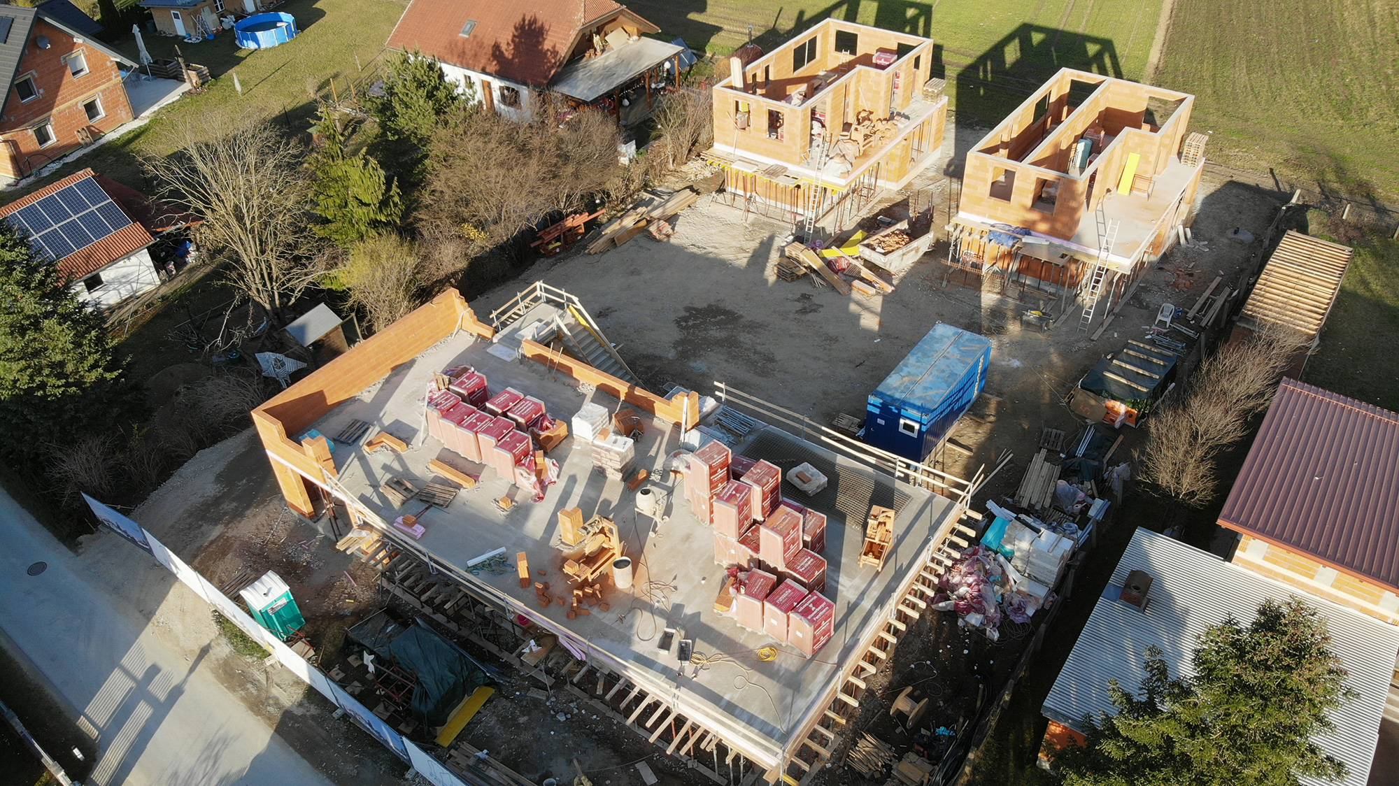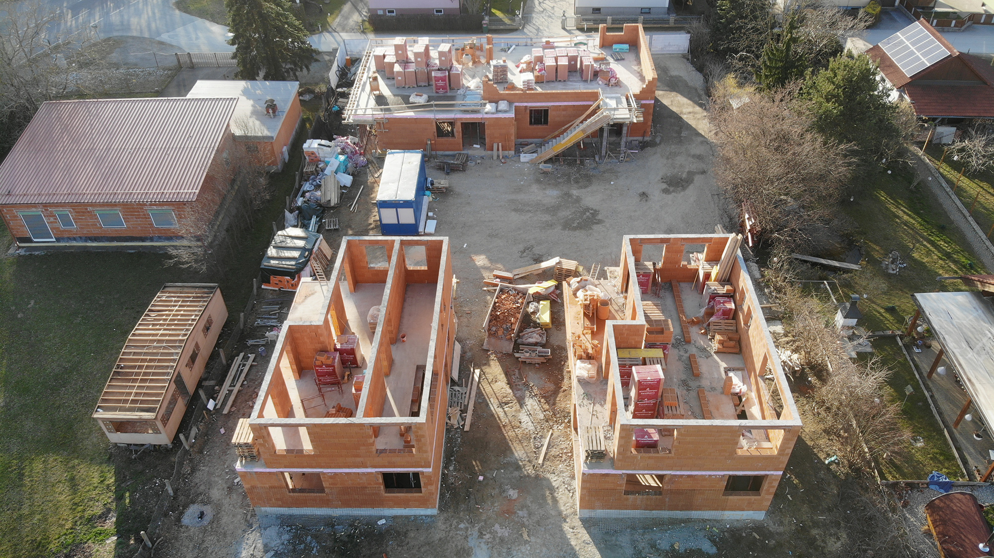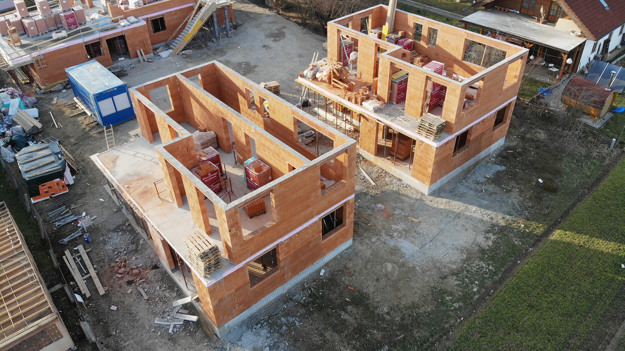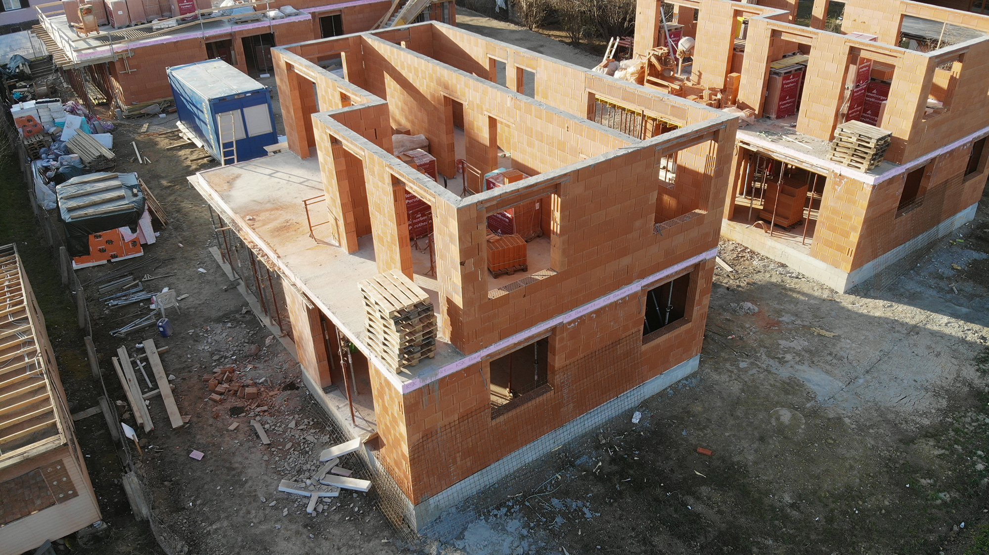 Inzwischen sind wir nämlich bei den Obergeschossen angelangt, wo die Außenwände bzw. die inneren tragenden Wände aufgemauert werden. Bei den beiden Einfamilienhäusern sind wir schon nahezu fertig, und können schon bald mit der Schalung der OG-Decken beginnen. Beim 3er-Wohnobjekt haben wir letzten Freitag bereits mit den Außenwänden begonnen.