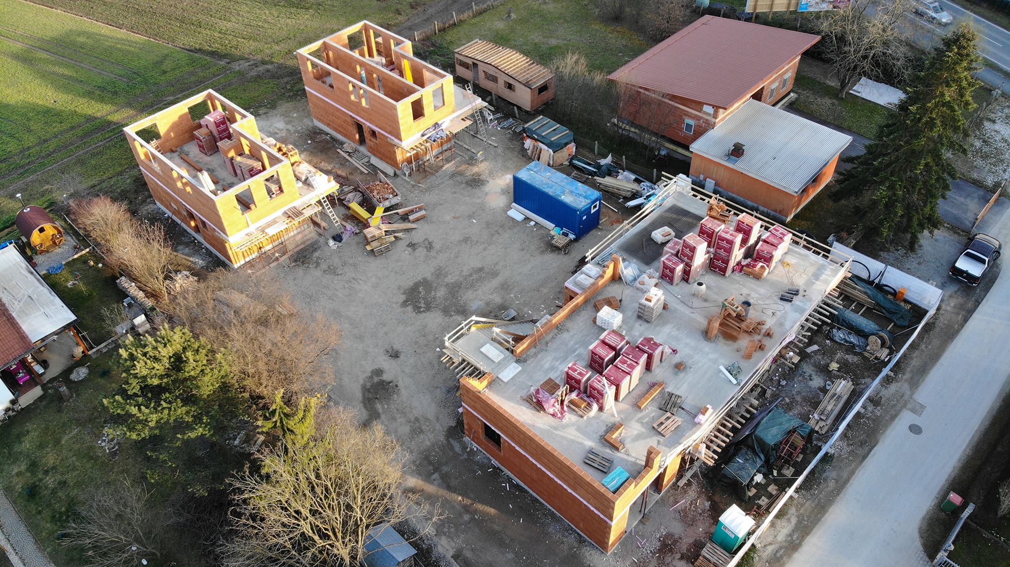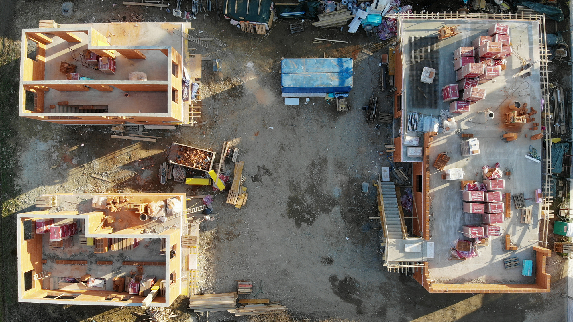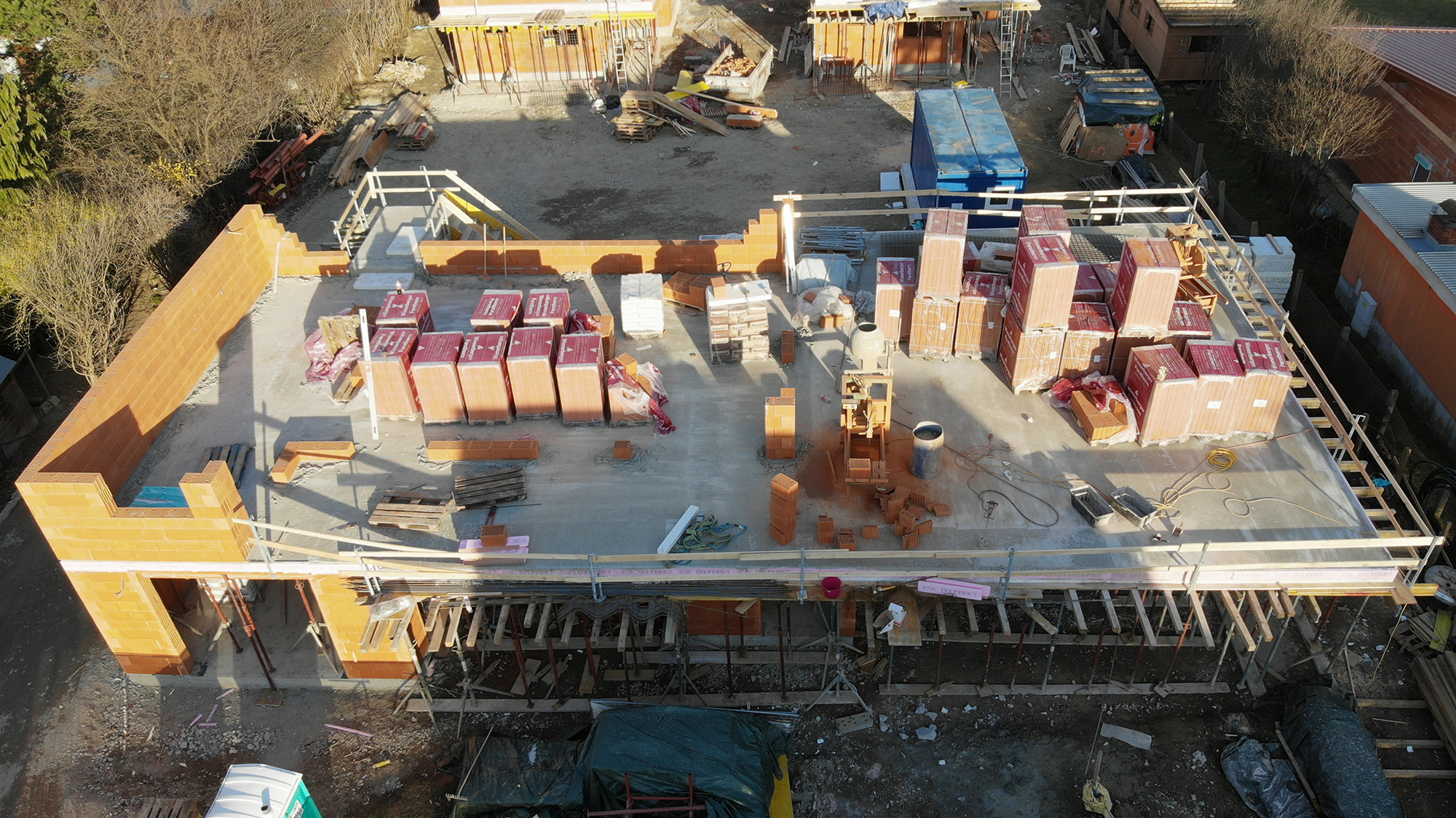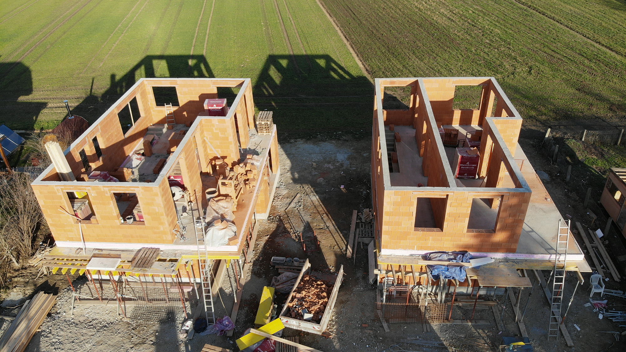 Inzwischen sind wir nämlich bei den Obergeschossen angelangt, wo die Außenwände bzw. die inneren tragenden Wände aufgemauert werden. Bei den beiden Einfamilienhäusern sind wir schon nahezu fertig, und können schon bald mit der Schalung der OG-Decken beginnen. Beim 3er-Wohnobjekt haben wir letzten Freitag bereits mit den Außenwänden begonnen.