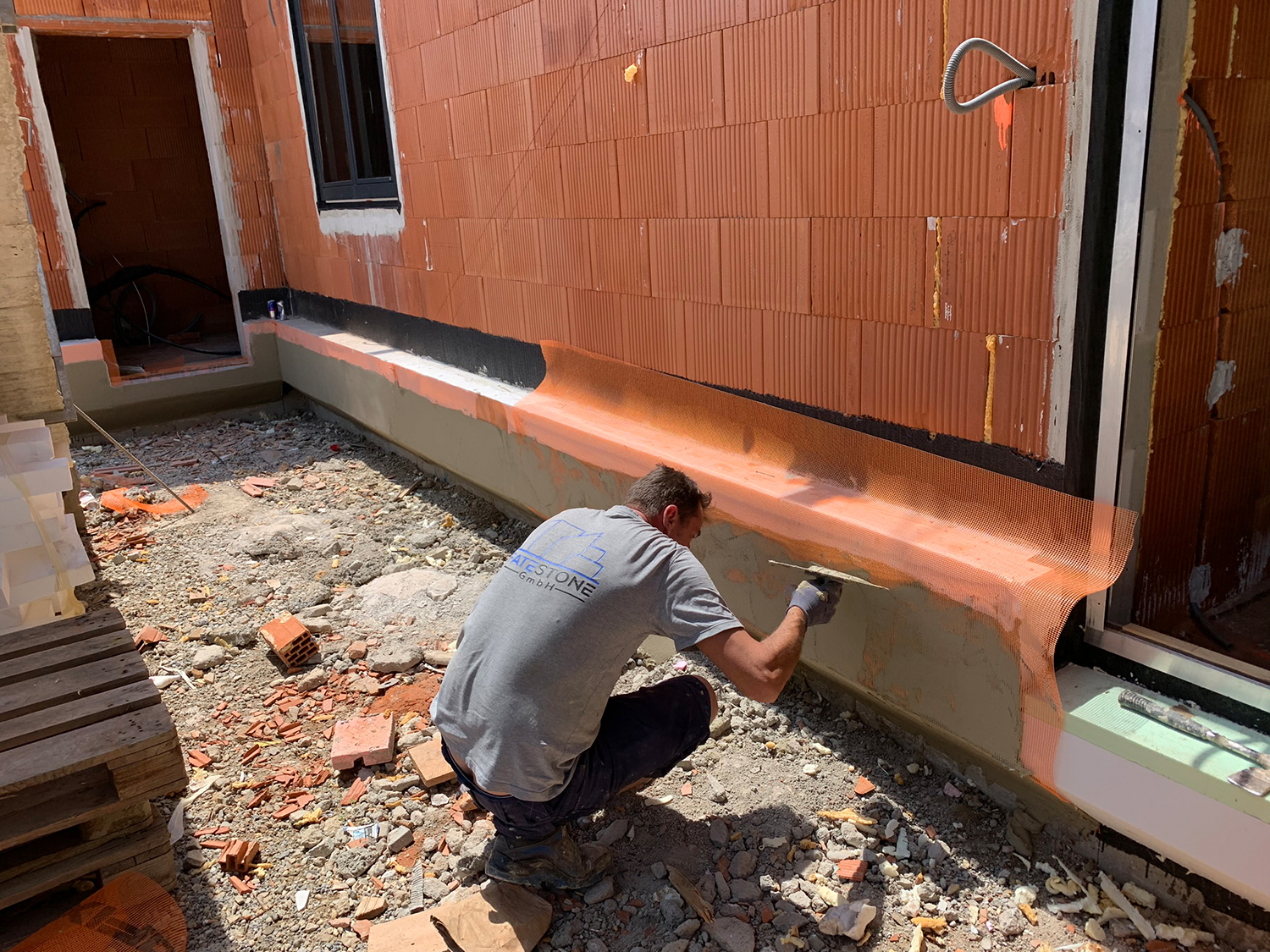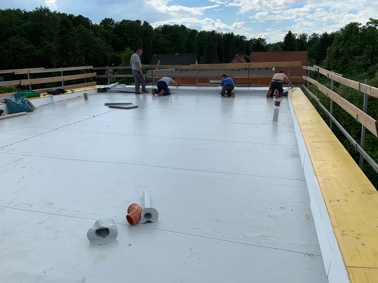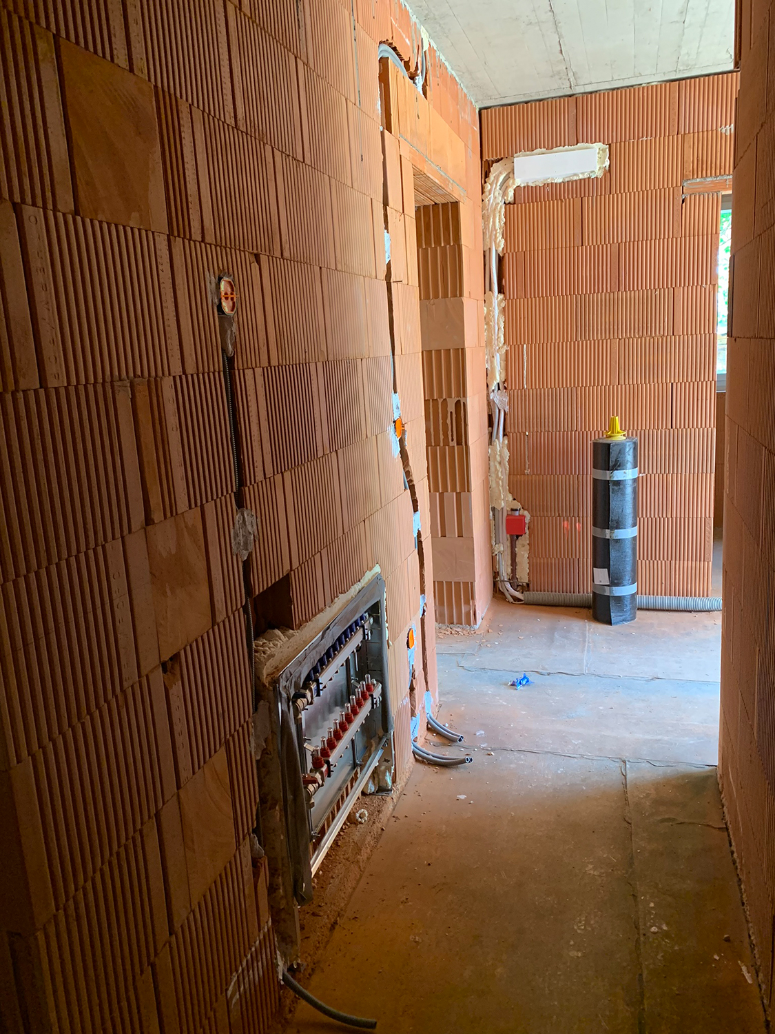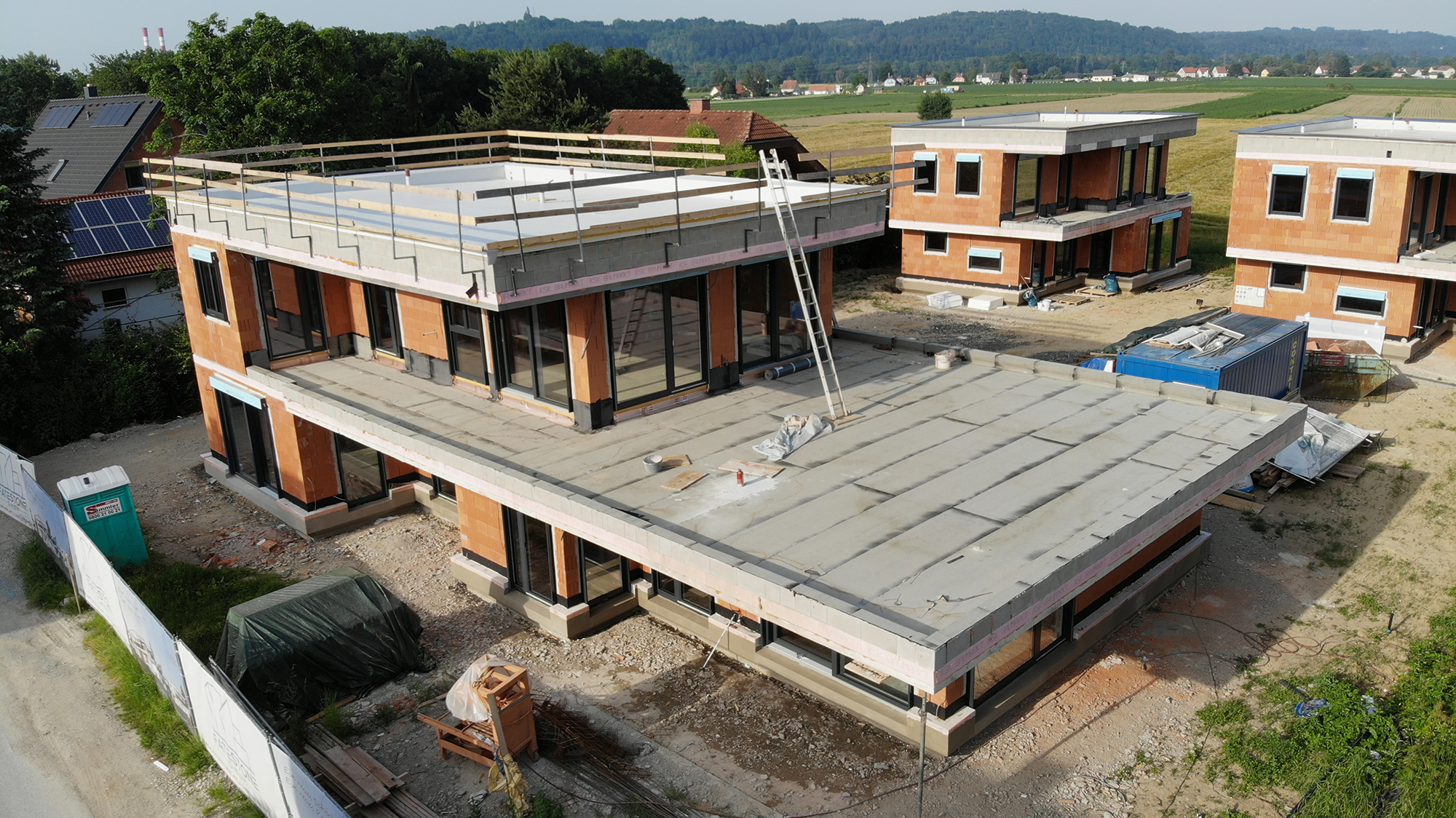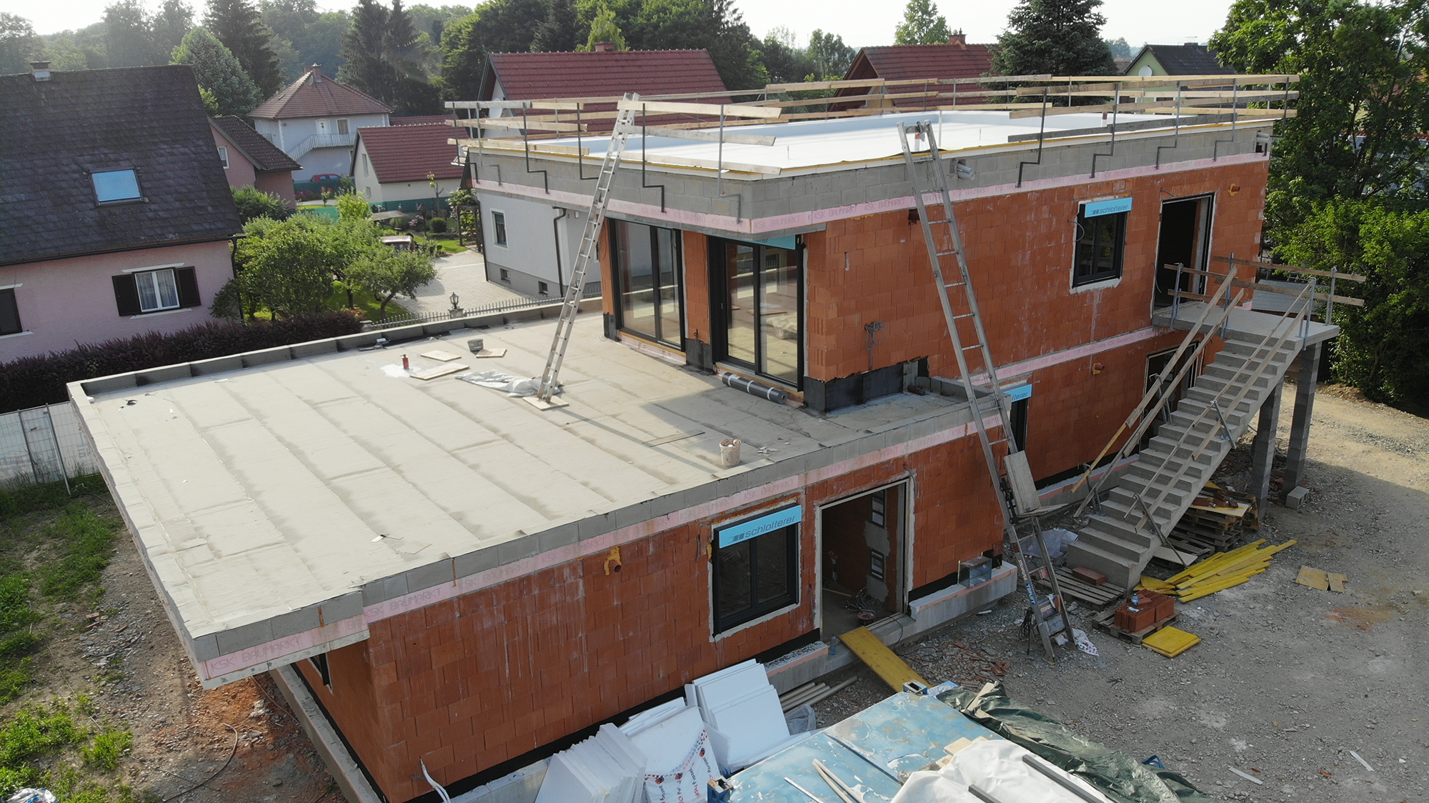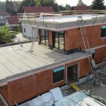 Sowohl die Elektriker als auch die Installateure haben bereits ihre ersten Phasen perfekt abgeschlossen. Soll heißen, alles, was unter den Putz gehört, wurde eingestemmt und verlegt. Währenddessen haben unsere Jungs auch schon die Bodenplatten im Sockelbereich gedämmt und abgedichtet. Dadurch ist schon mal der Schutz für den Sockelbereich gegeben, aber dies ist auch quasi die erste Vorarbeit für die Fassade. Inzwischen haben wir auch schon die Flachdächer begonnen abzudichten, sodass der Wassereintritt ins Haus gänzlich ausgeschlossen werden kann.