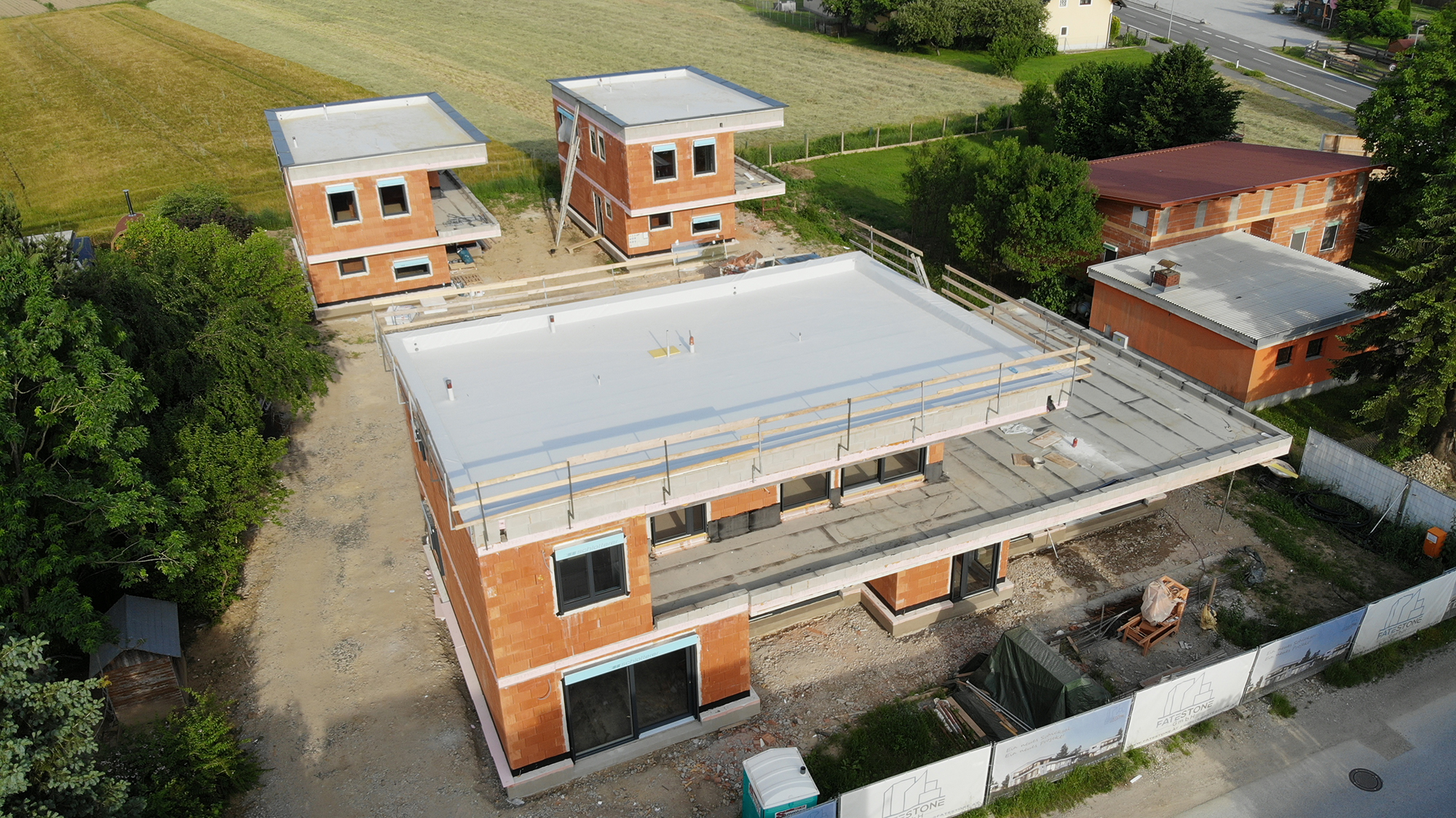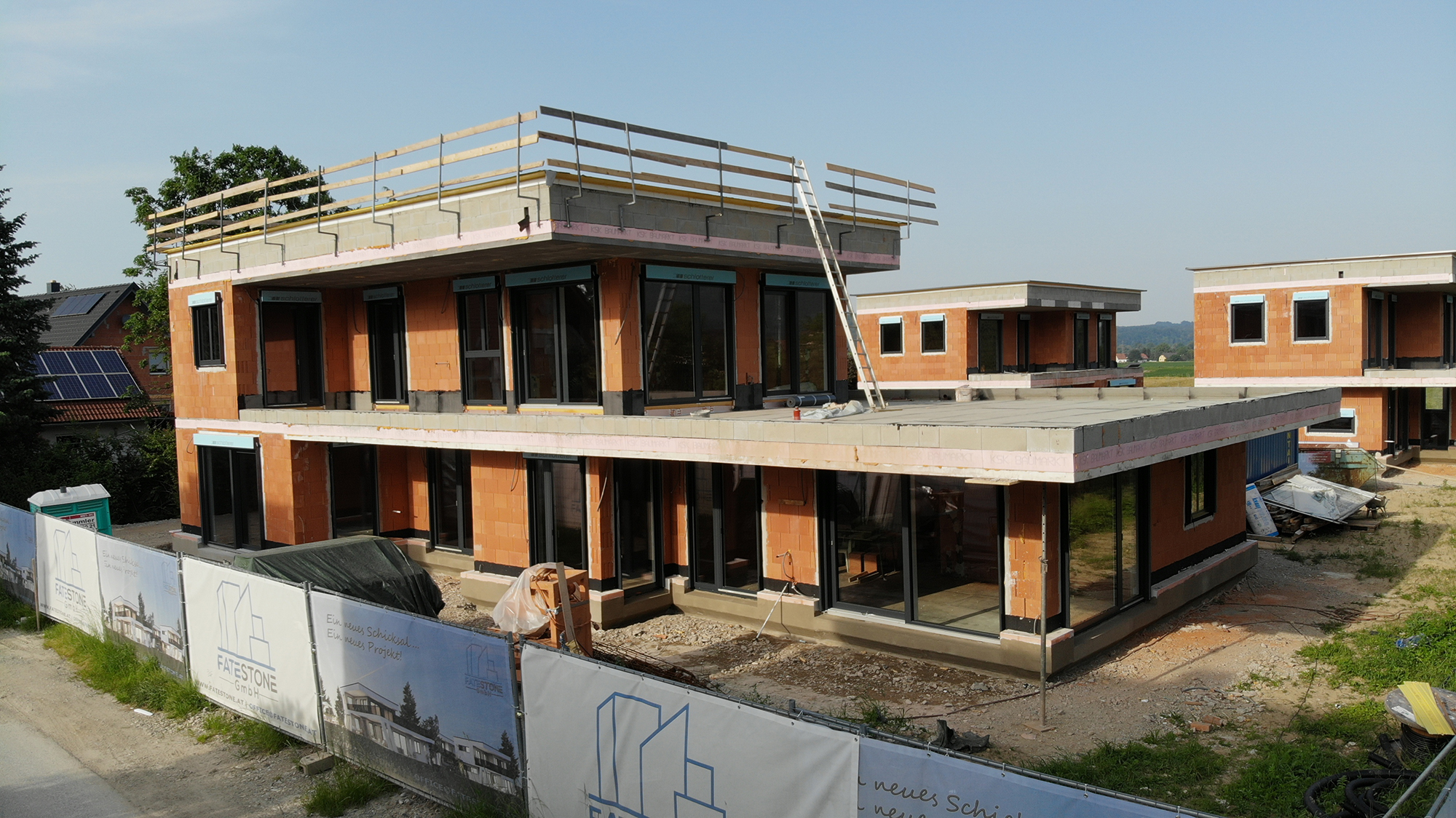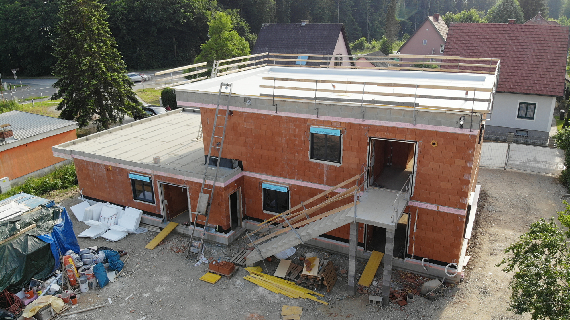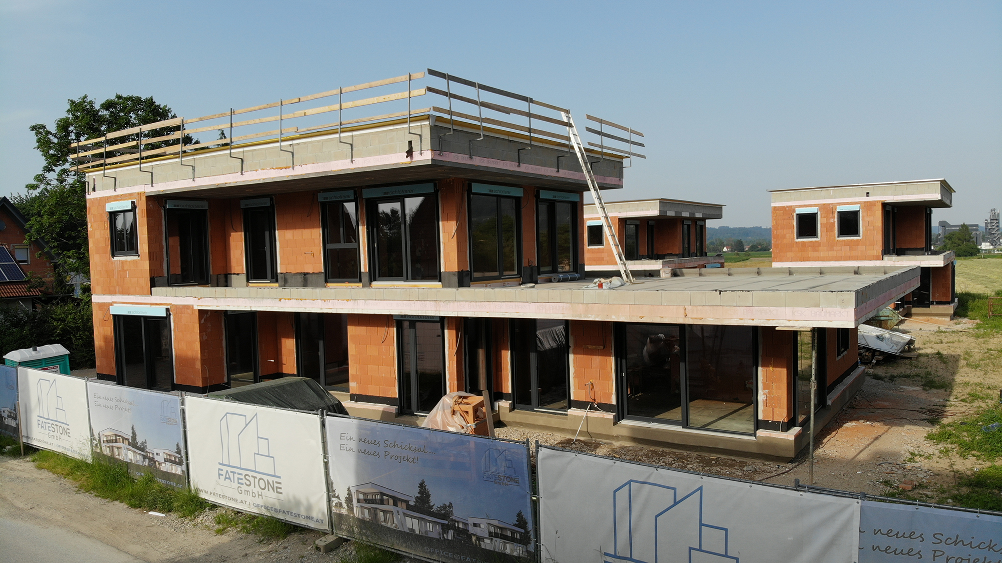 Sowohl die Elektriker als auch die Installateure haben bereits ihre ersten Phasen perfekt abgeschlossen. Soll heißen, alles, was unter den Putz gehört, wurde eingestemmt und verlegt. Währenddessen haben unsere Jungs auch schon die Bodenplatten im Sockelbereich gedämmt und abgedichtet. Dadurch ist schon mal der Schutz für den Sockelbereich gegeben, aber dies ist auch quasi die erste Vorarbeit für die Fassade. Inzwischen haben wir auch schon die Flachdächer begonnen abzudichten, sodass der Wassereintritt ins Haus gänzlich ausgeschlossen werden kann.