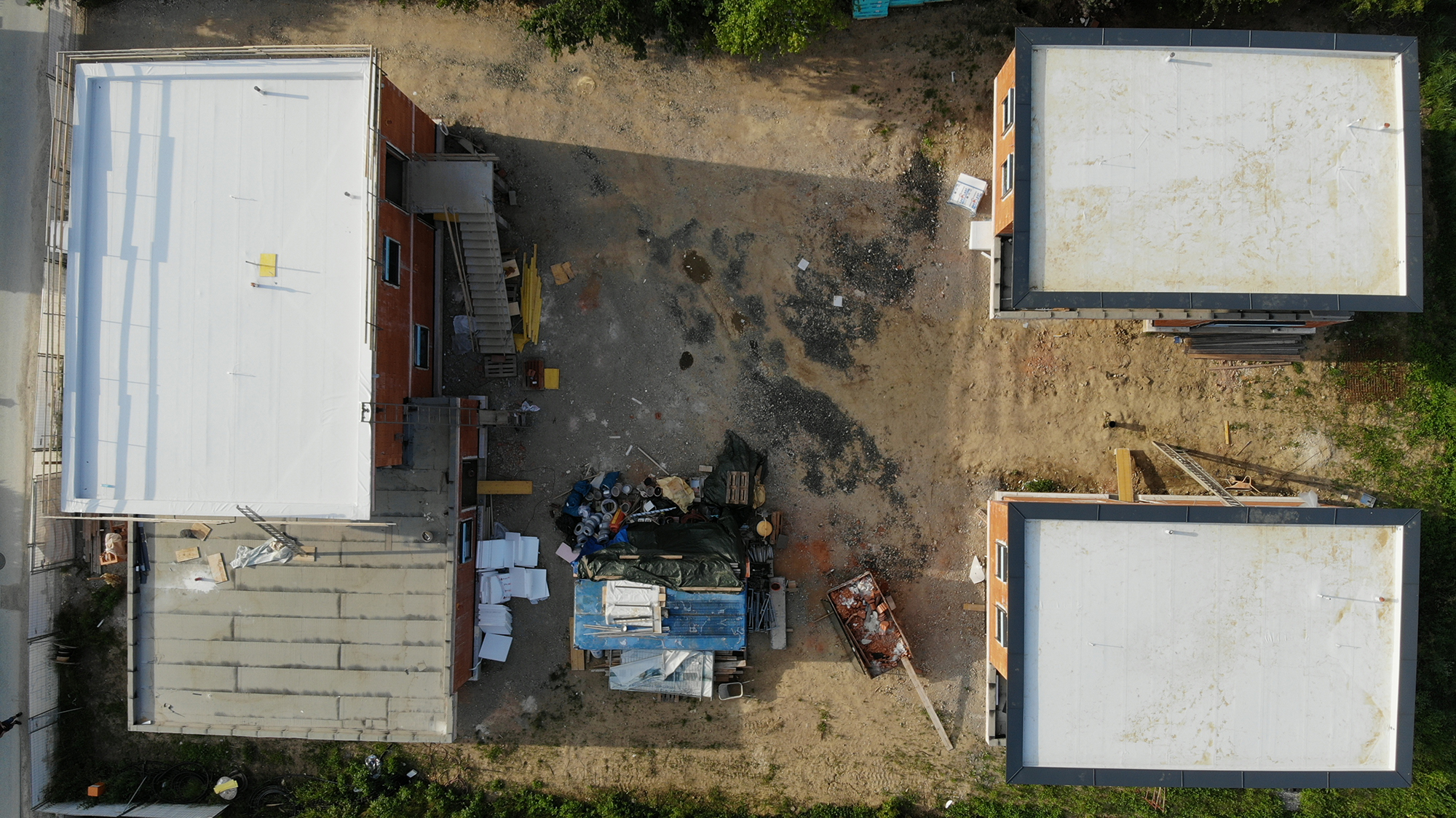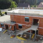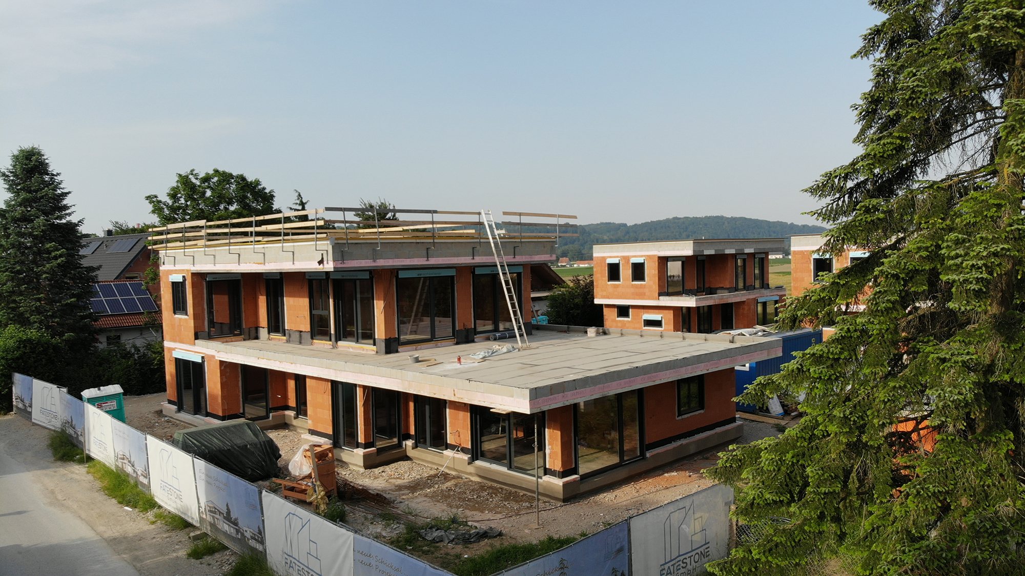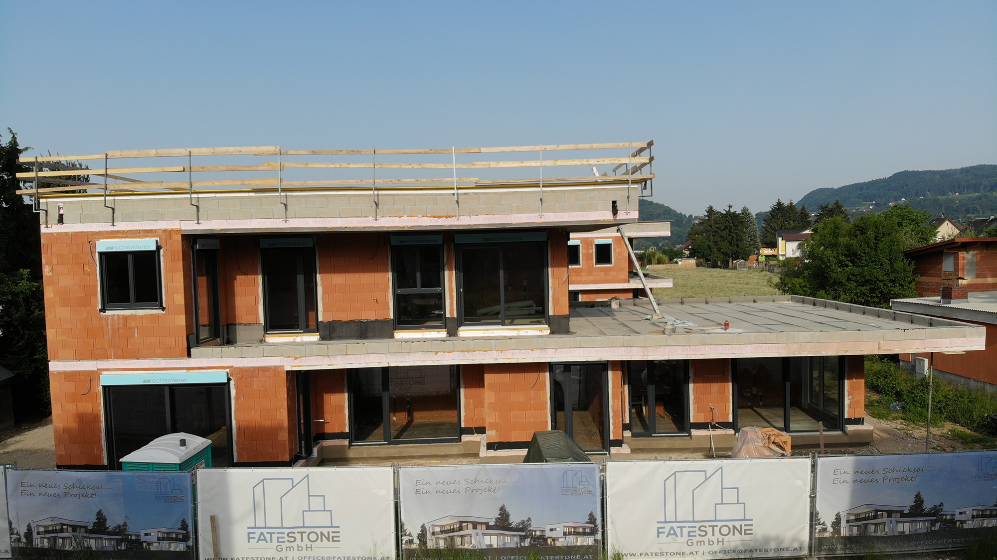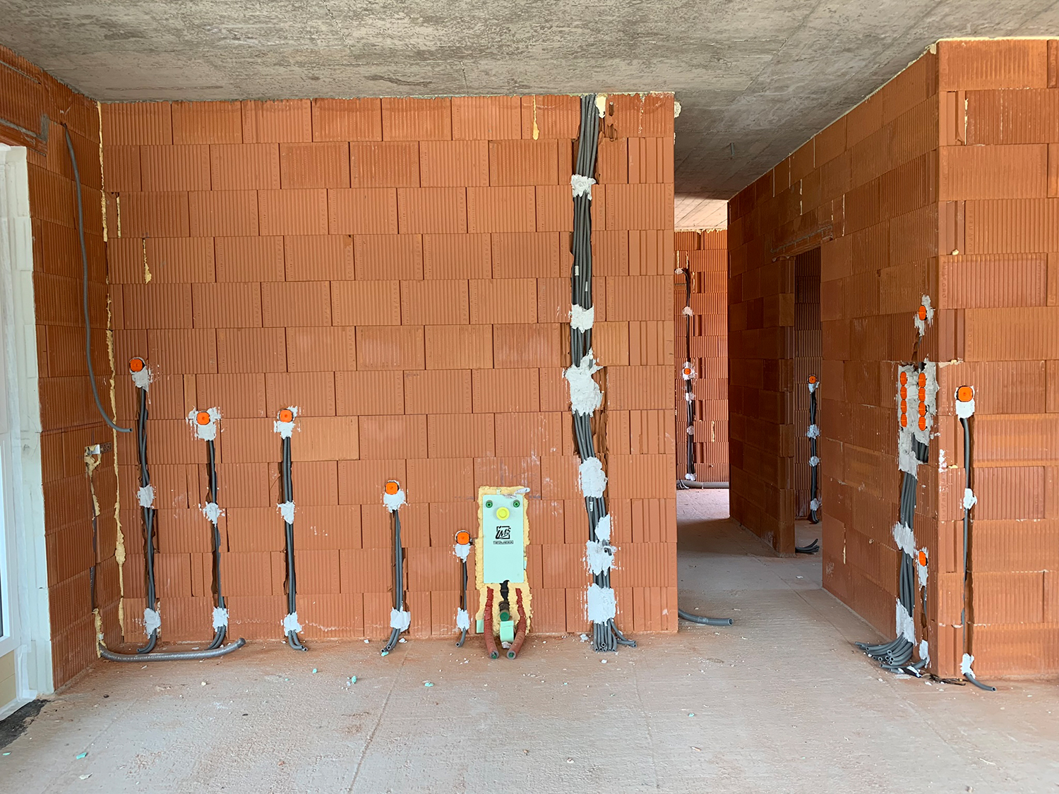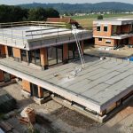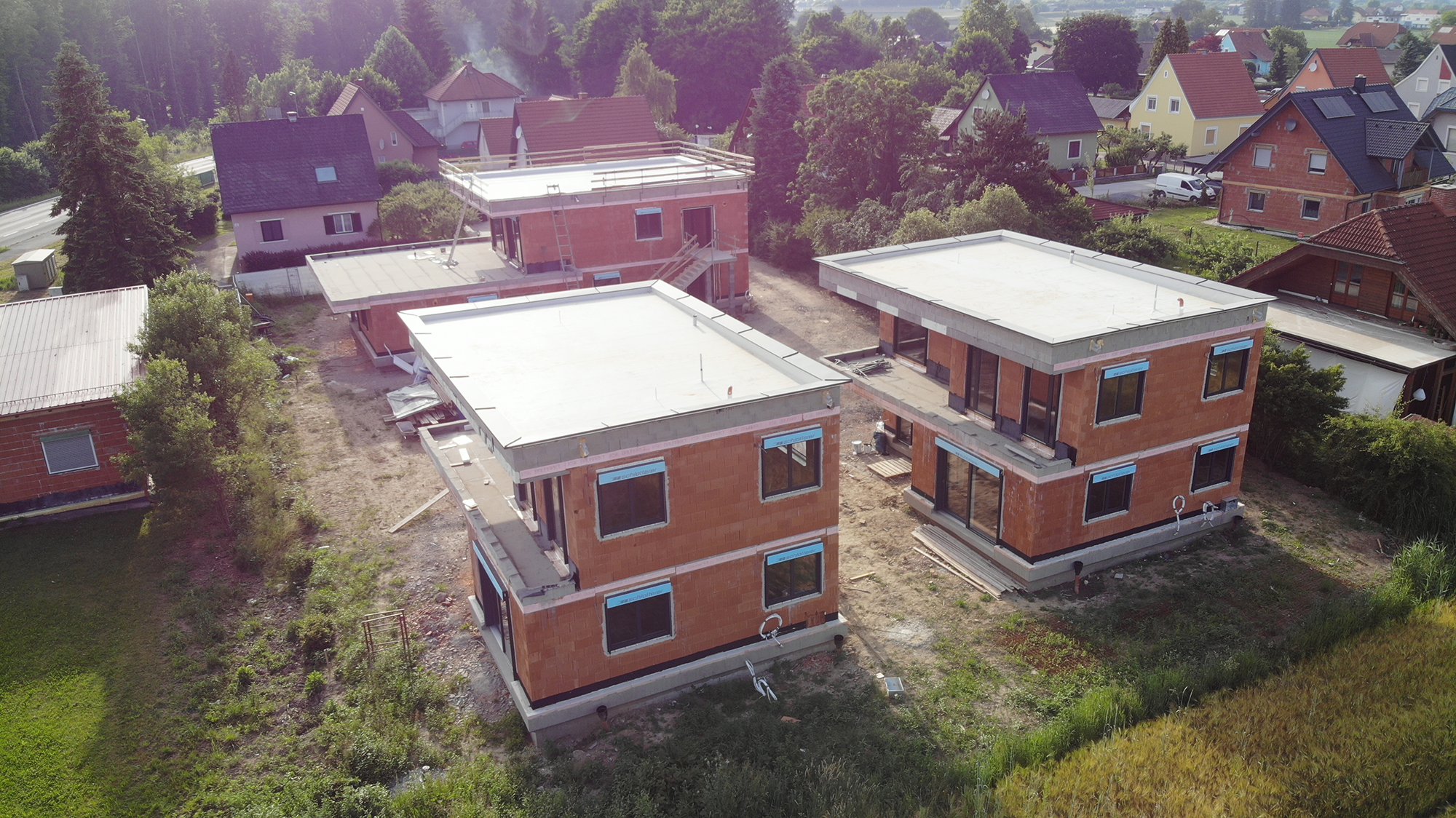 Sowohl die Elektriker als auch die Installateure haben bereits ihre ersten Phasen perfekt abgeschlossen. Soll heißen, alles, was unter den Putz gehört, wurde eingestemmt und verlegt. Währenddessen haben unsere Jungs auch schon die Bodenplatten im Sockelbereich gedämmt und abgedichtet. Dadurch ist schon mal der Schutz für den Sockelbereich gegeben, aber dies ist auch quasi die erste Vorarbeit für die Fassade. Inzwischen haben wir auch schon die Flachdächer begonnen abzudichten, sodass der Wassereintritt ins Haus gänzlich ausgeschlossen werden kann.