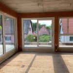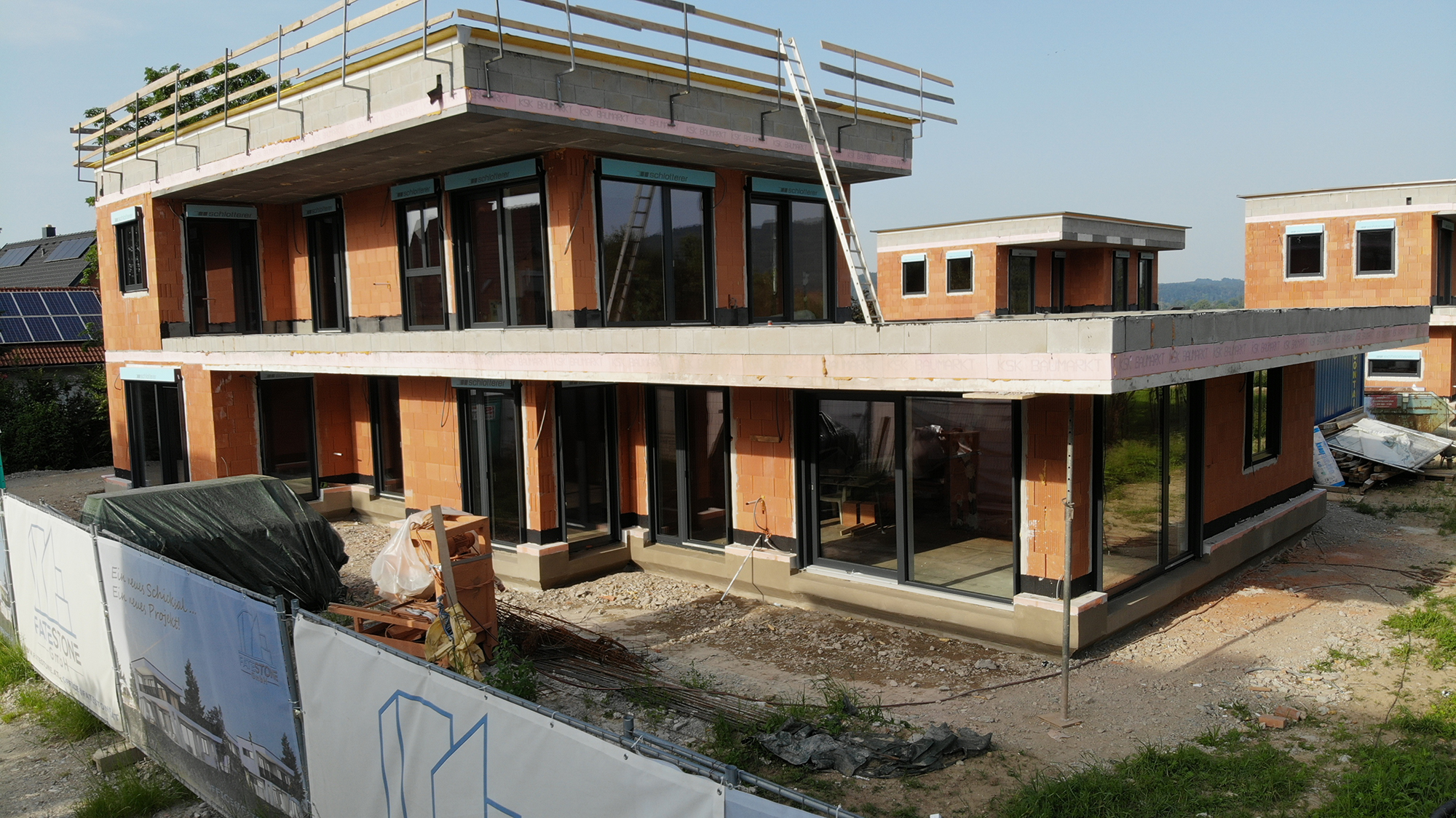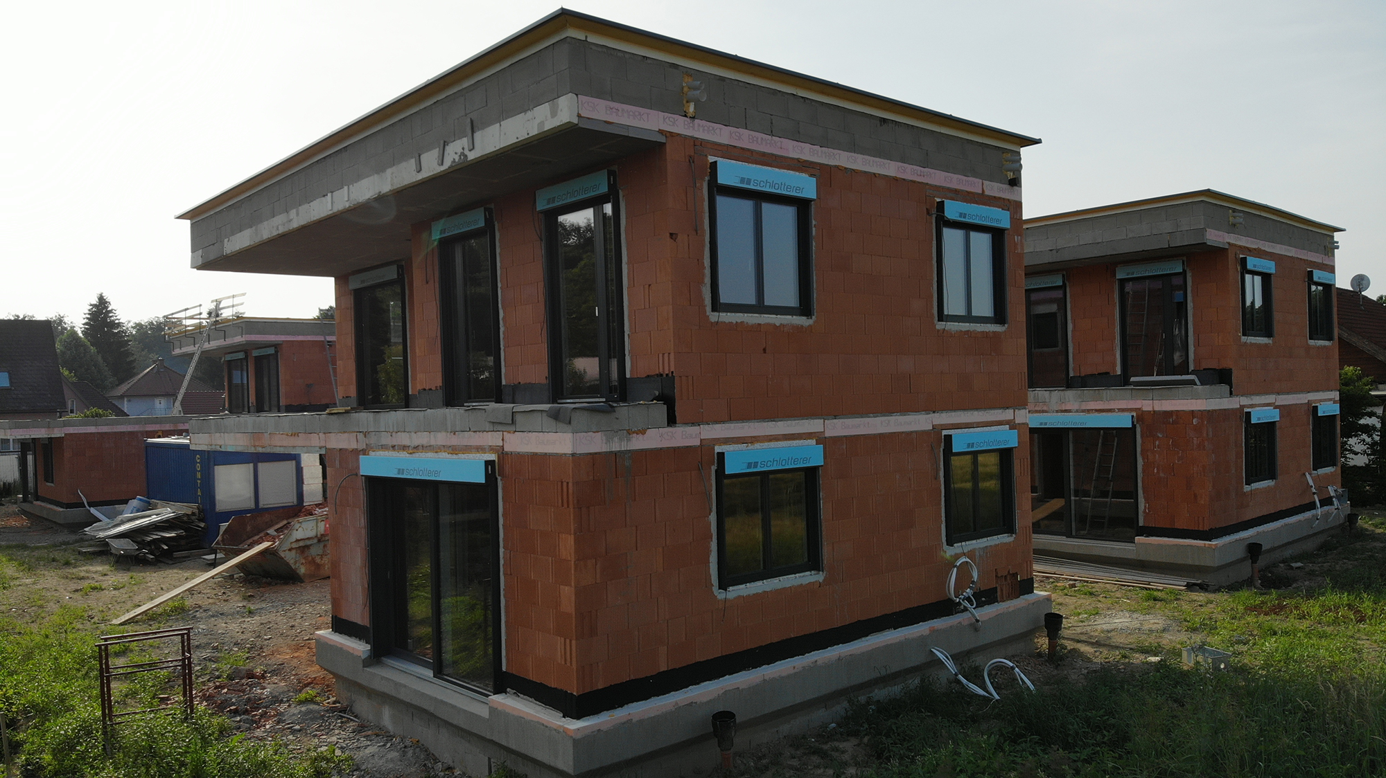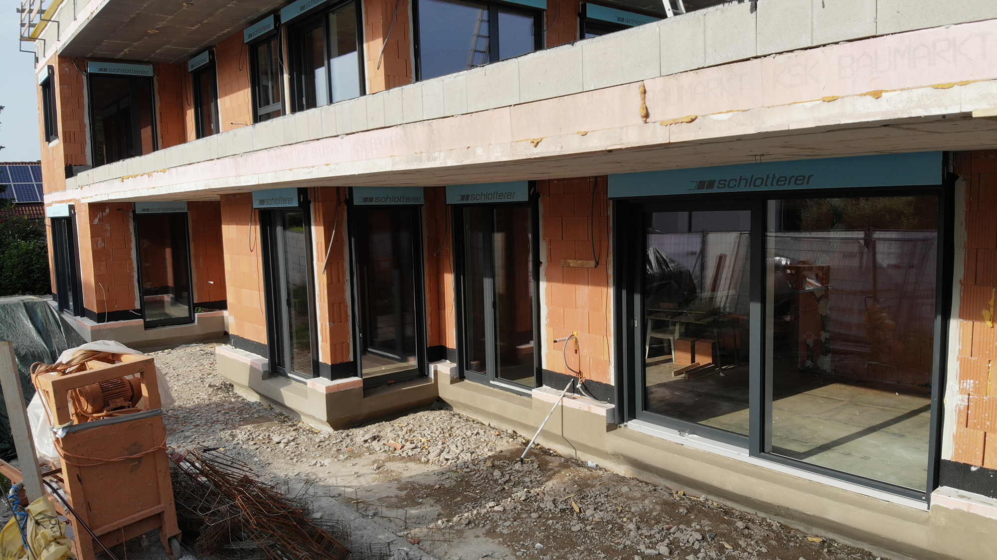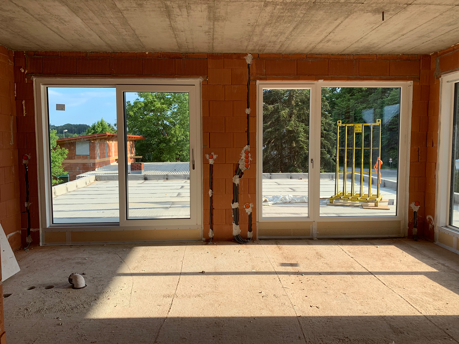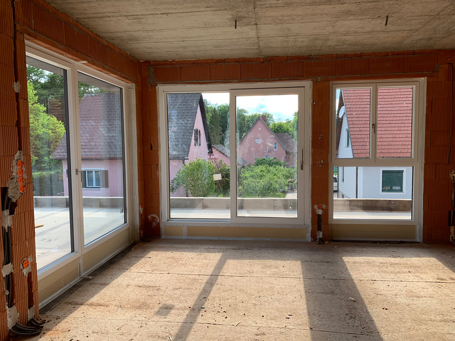 Nachdem also die Flachdächer dicht waren, war auch schon die Lieferung unserer Fenster von unserem Qualitätspartner Josko da. Diese wurden anschließend meisterhaft eingebaut, wodurch der Rohbau plötzlich einen komplett neuen Look zu bieten hatte. Im Anschluss wurden natürlich auch die Sonnenschutz-Elemente eingebaut, die von unserem Qualitätspartner Schlotterer geliefert wurden.
