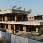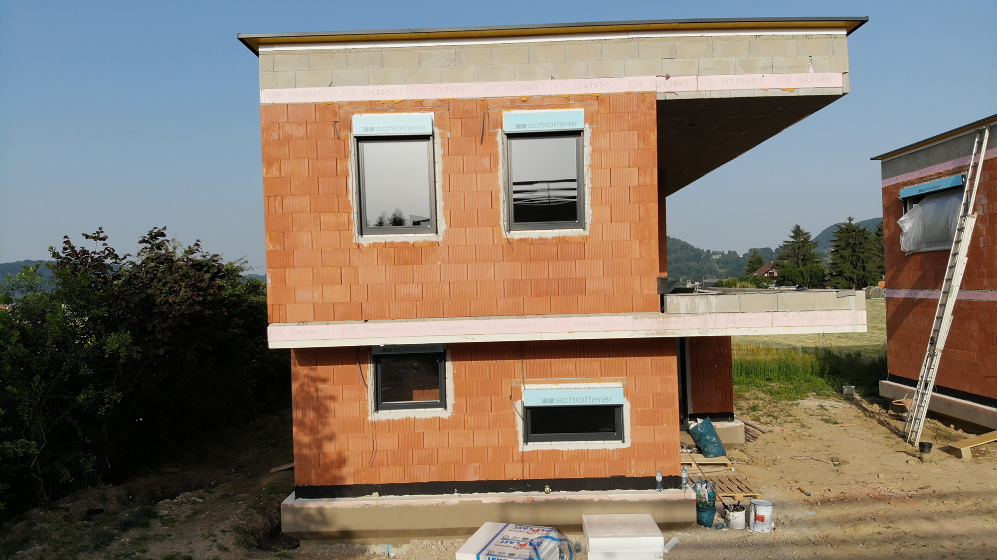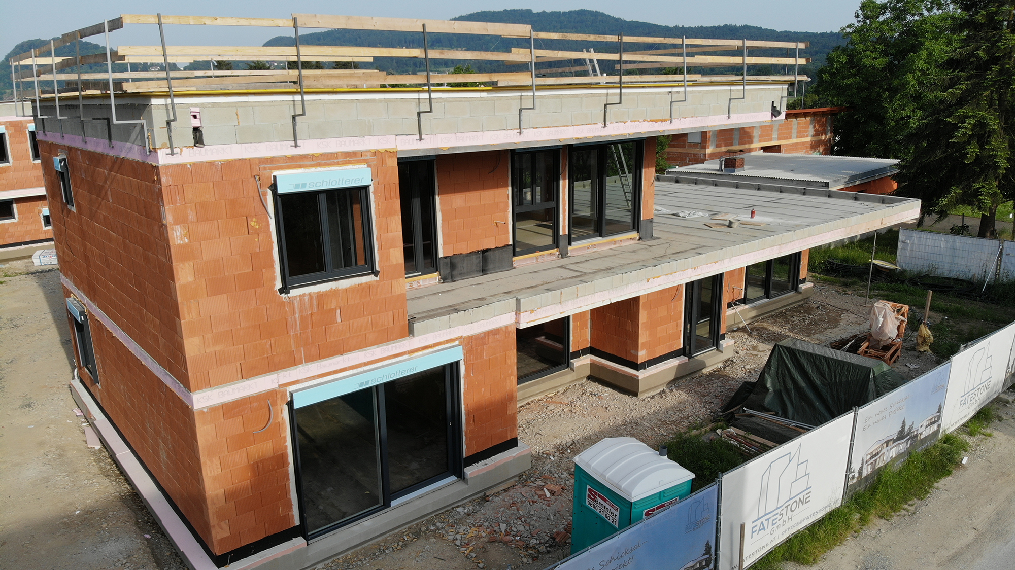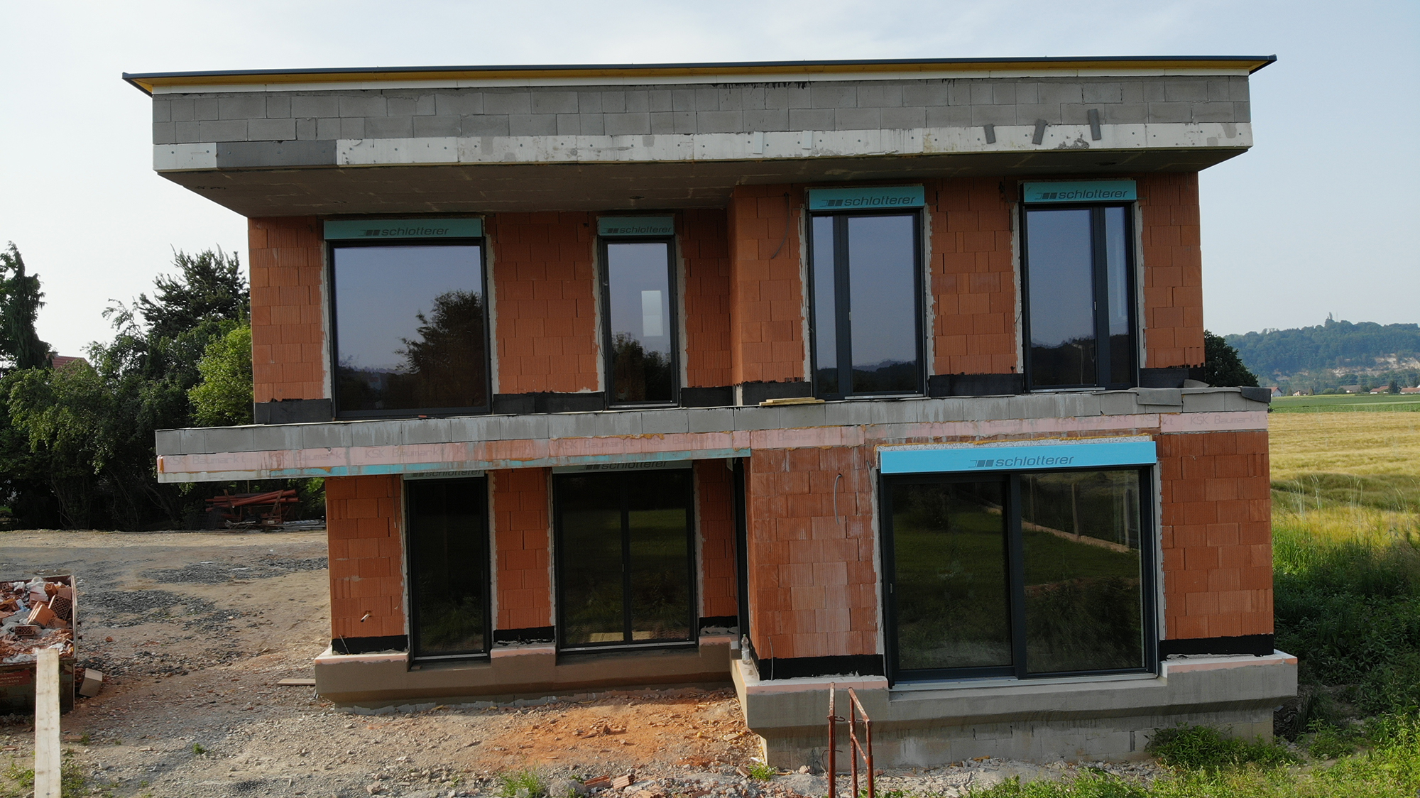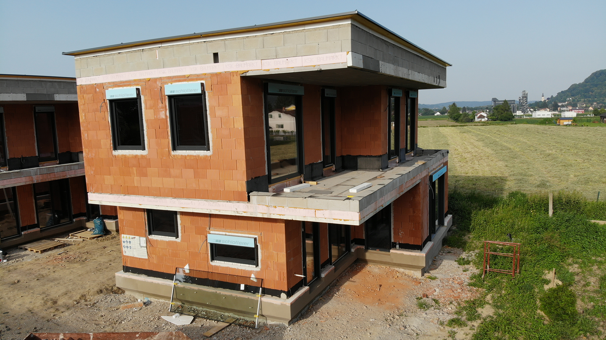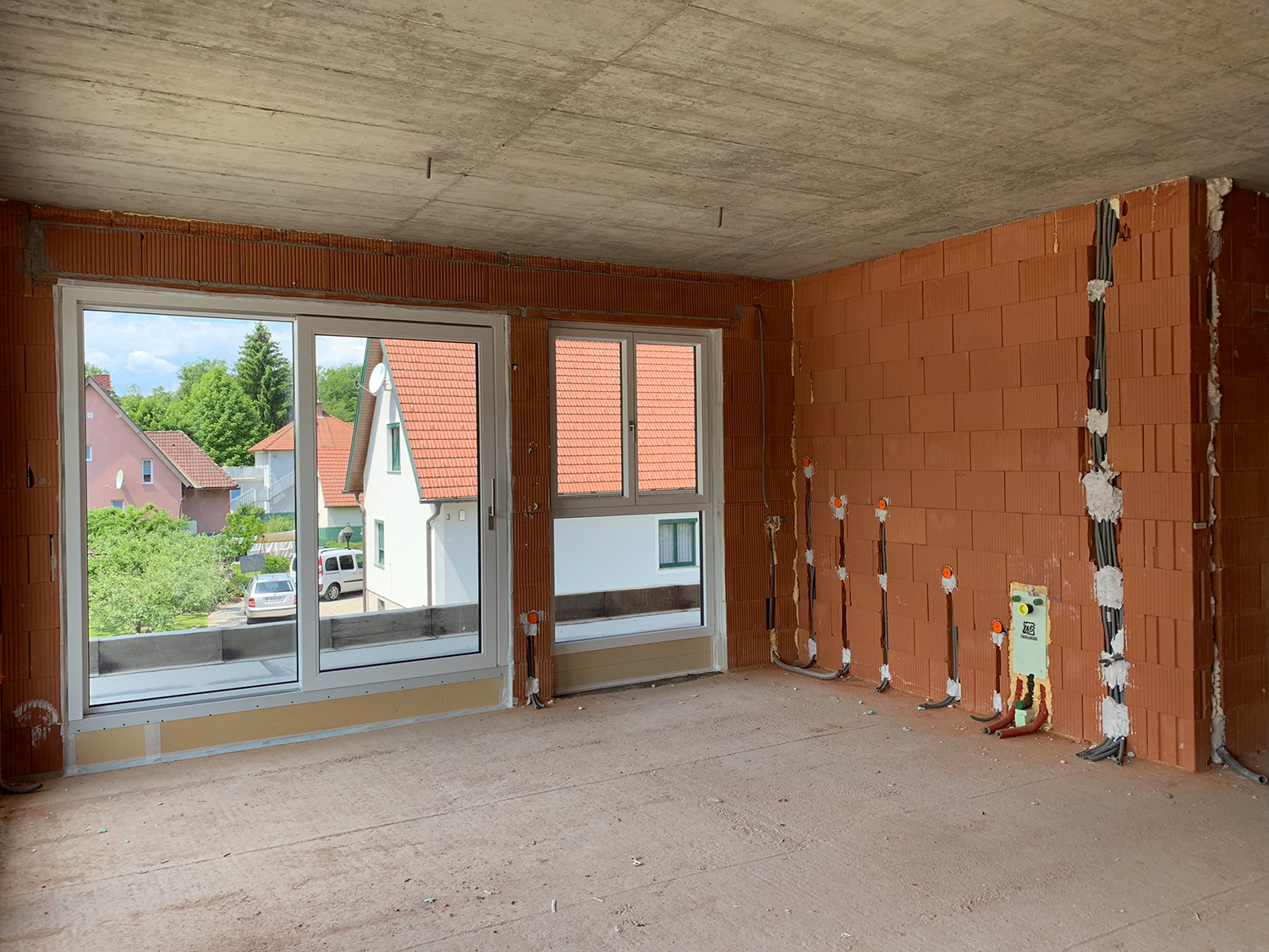 Nachdem also die Flachdächer dicht waren, war auch schon die Lieferung unserer Fenster von unserem Qualitätspartner Josko da. Diese wurden anschließend meisterhaft eingebaut, wodurch der Rohbau plötzlich einen komplett neuen Look zu bieten hatte. Im Anschluss wurden natürlich auch die Sonnenschutz-Elemente eingebaut, die von unserem Qualitätspartner Schlotterer geliefert wurden.