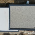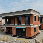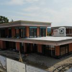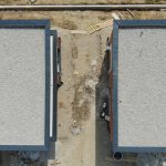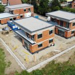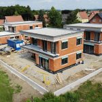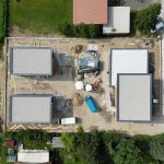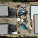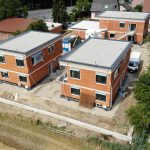 Während also die Innenputz-Partie im Inneren der Objekte beschäftigt war, ging es auch im Außenbereich recht flott zur Sache. Einerseits wurden parallel dazu auch die Flachdächer bekiest, sodass der Flachdachaufbau notwendigerweise anständig belastet wurde, aber auch der Anblick aus der Vogelperspektive ist nicht von der Hand zu weisen. Andererseits wurden auch die Gasleitungen über das Grundstück verlegt und in den jeweiligen Verteilern eingeführt.