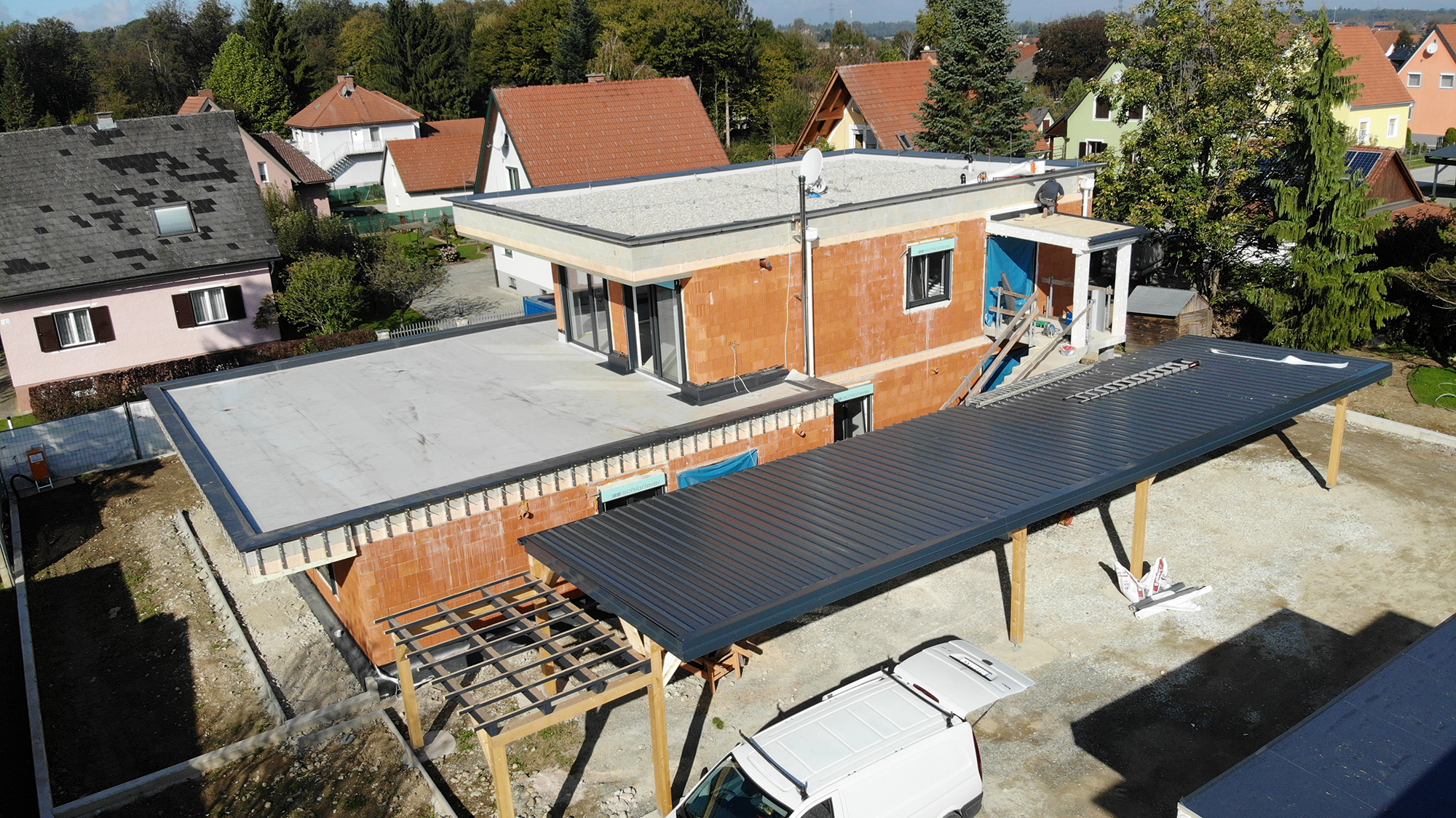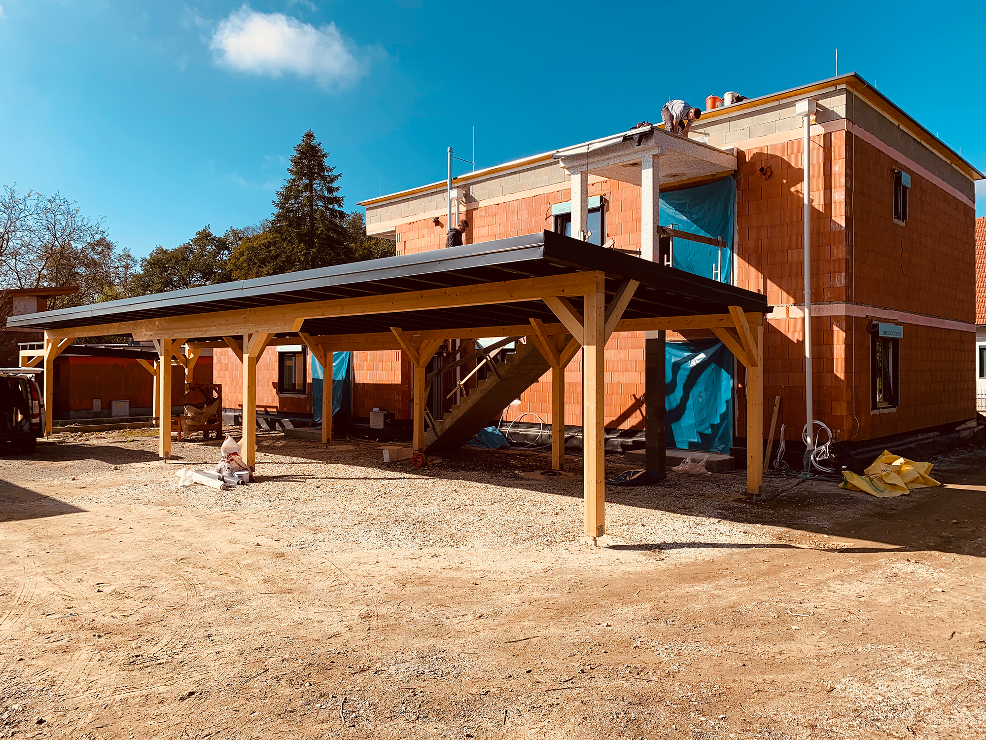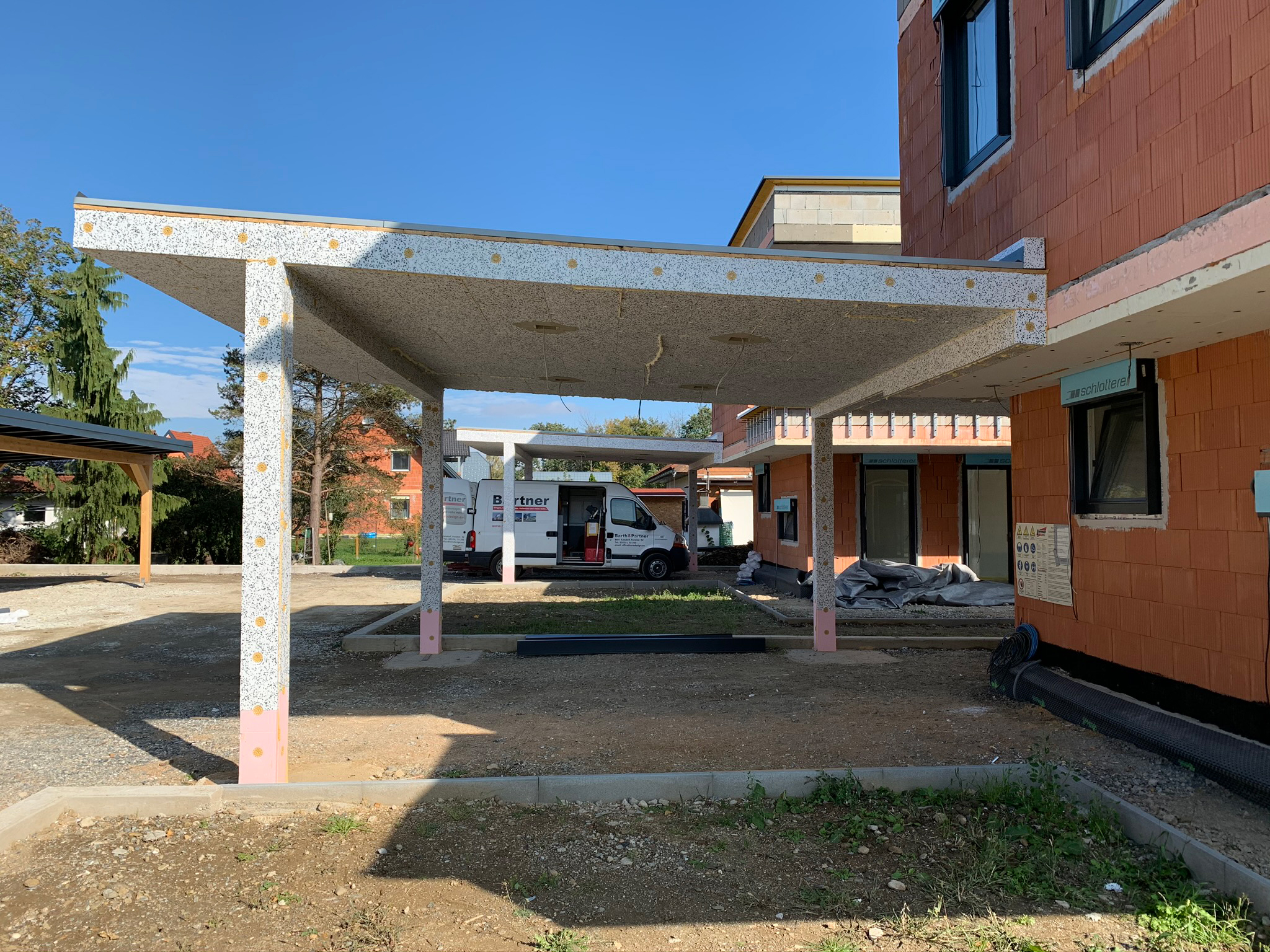 Inzwischen wurden die Carports, die einerseits den Einfamilienhäusern und andererseits der Wohngemeinschaft zugeordnet sind, erfolgreich abgeschlossen. Zwar wird demnächst noch der große gemeinschaftliche Carport farblich seinen Final-Anstrich bekommen, und es werden noch hier und da Spenglerbleche angebracht werden, aber grundsätzlich gilt diese Mission als abgeschlossen.
