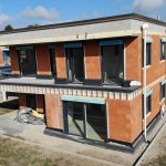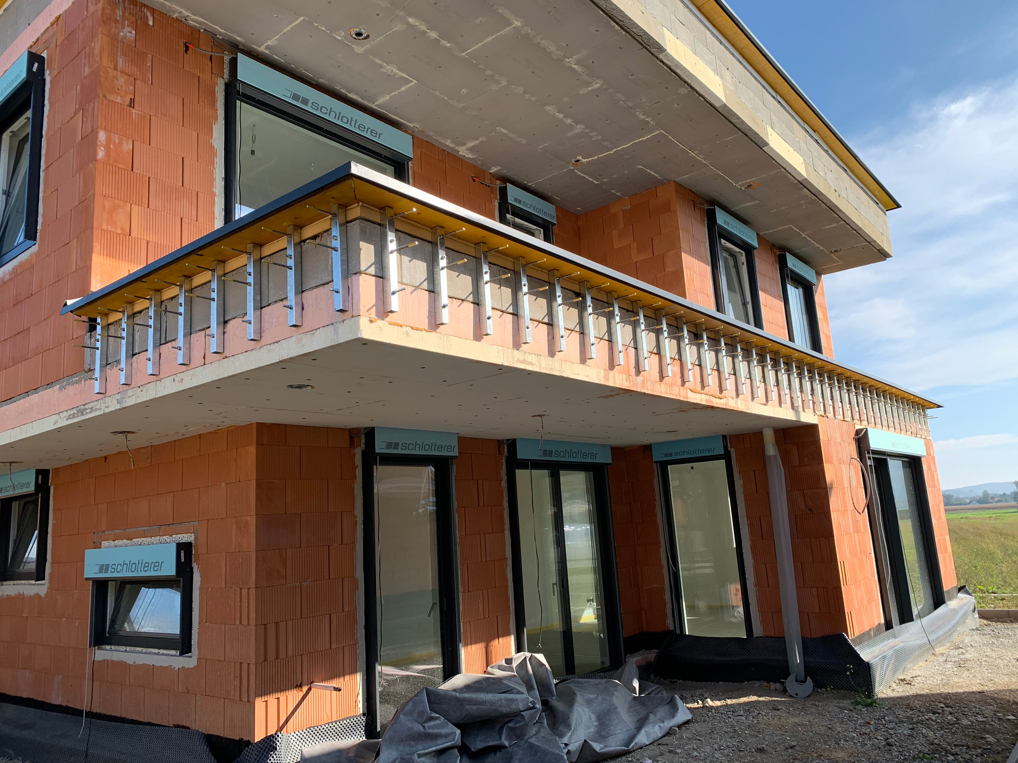 So, wie es wichtig war, die Carports noch vor der Fassade fertigzustellen, so gleichermaßen wichtig waren auch andere Aufgaben, damit wir mit der Ausführung der Fassade beginnen können. Demzufolge wurden auch schon die Konsolen für die Nurglasgeländer an den Balkons und Terrassen angeschraubt. Dadurch ist für eine spätere Montage vorgesorgt, sodass die Schwarzglas-Scheiben mit sicherem Halt positioniert werden können.