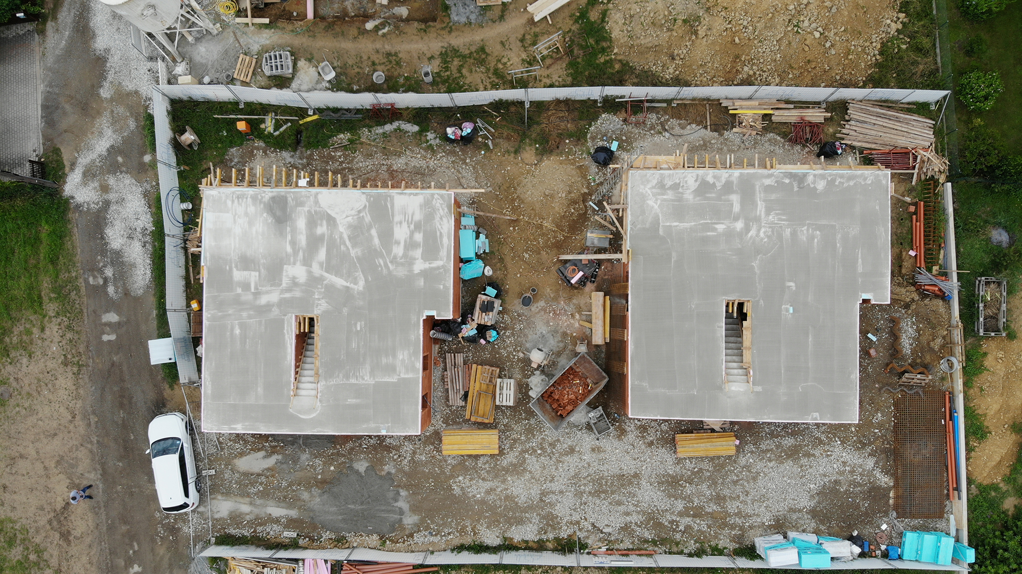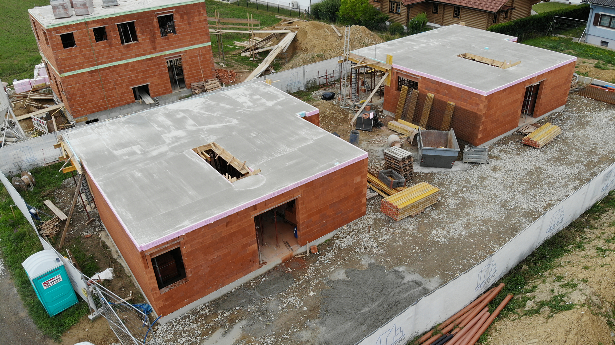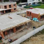 Nur wenige Tage, nachdem die Wände im Erdgeschoss aufgemauert waren, steht nun auch schon die Erdgeschoss-Decke bei beiden Häusern. Wohlgemerkt arbeiten wir gleichzeitig an zwei Einfamilienhäusern, sodass die Ausführungsdauer in der Tat zügig erfolgt. Nach einer kurzen Verschnaufpause übers Wochenende geht es am Montag direkt mit dem Aufmauern der Obergeschoss-Außenwände weiter. Doch bevor nun auch die Wände im Obergeschoss aufgestellt werden, möchten wir euch erst ein paar Bilder vom Jetzt-Zustand näherbringen: