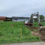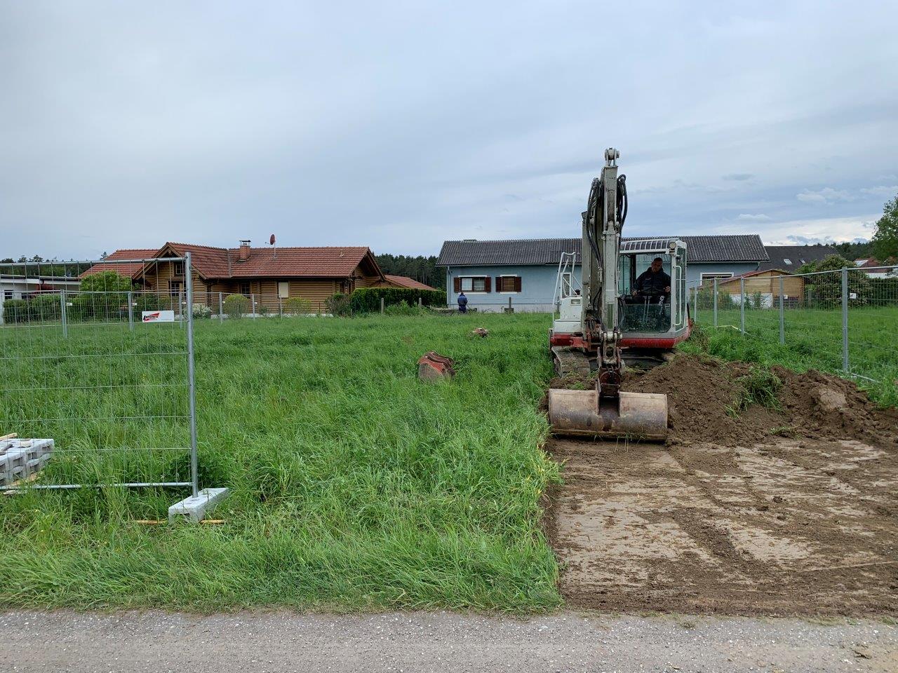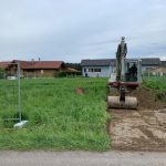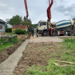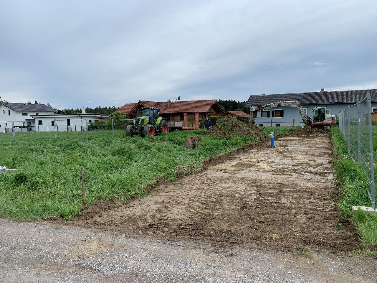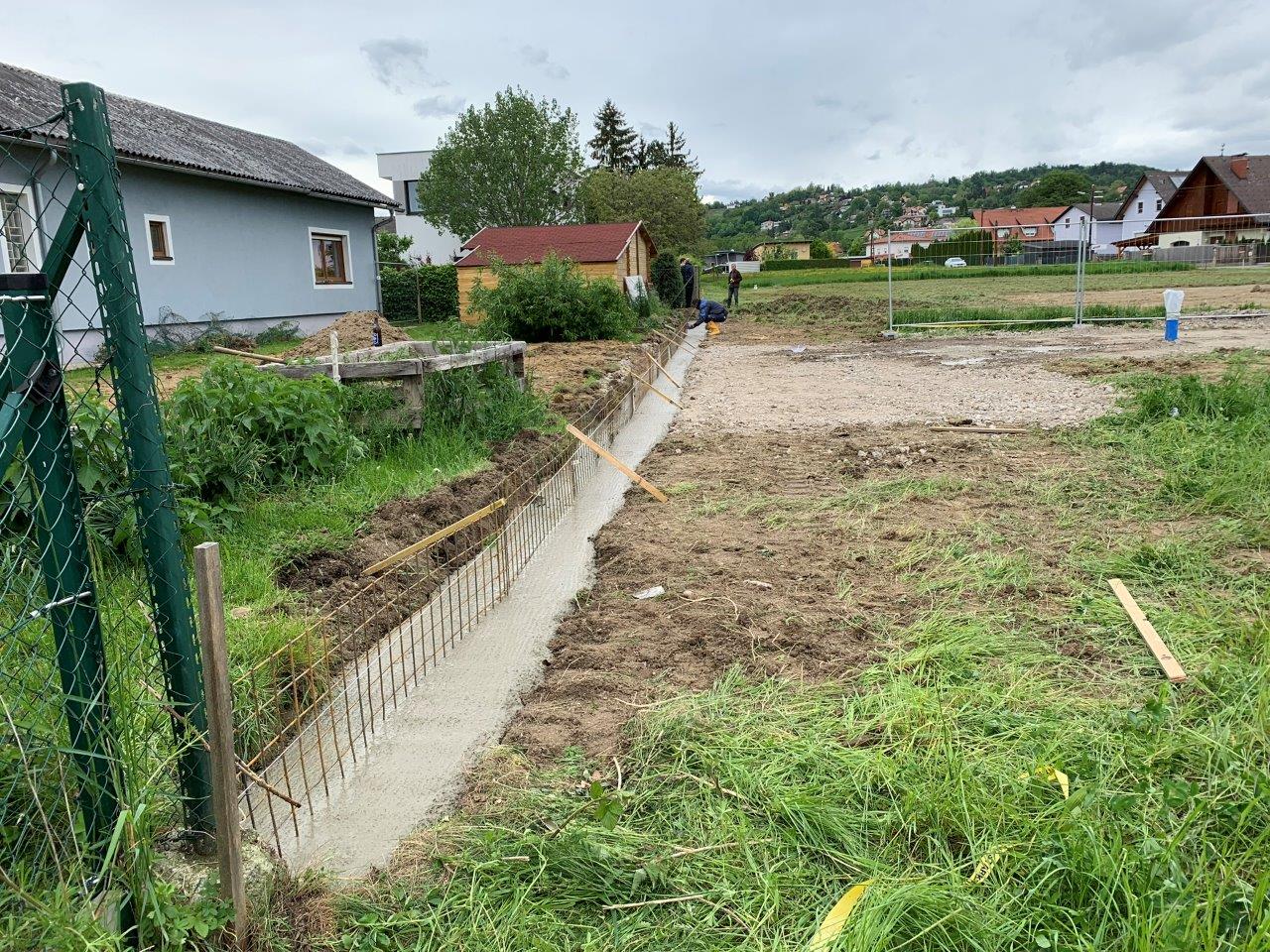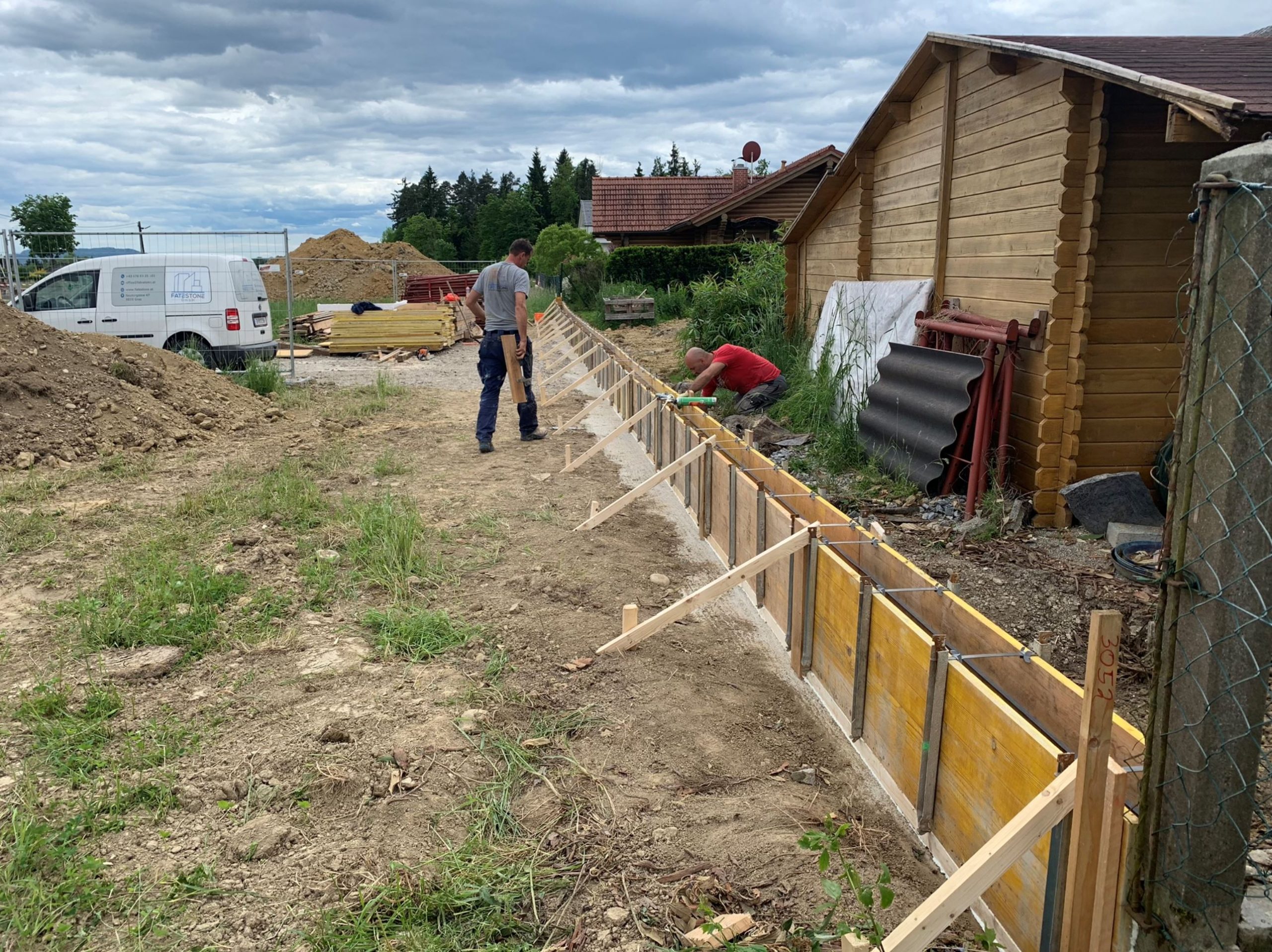 Nachdem uns das Wetter, wie so oft, durch die heftigen Regenfälle einen Strich durch die Rechnung gemacht hat, und somit der Baubeginn im Hofstättenweg zurückverlegt werden musste, konnten wir inzwischen zumindest die Einfahrt schottern, den Baustrom und das Bauwasser installieren sowie den ersten Zaunsockel betonieren.