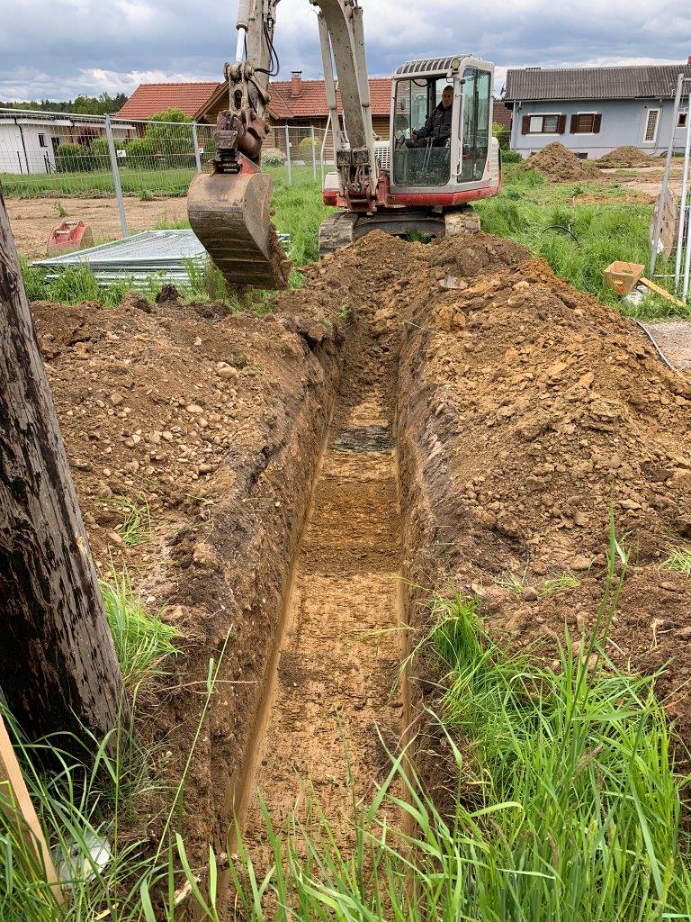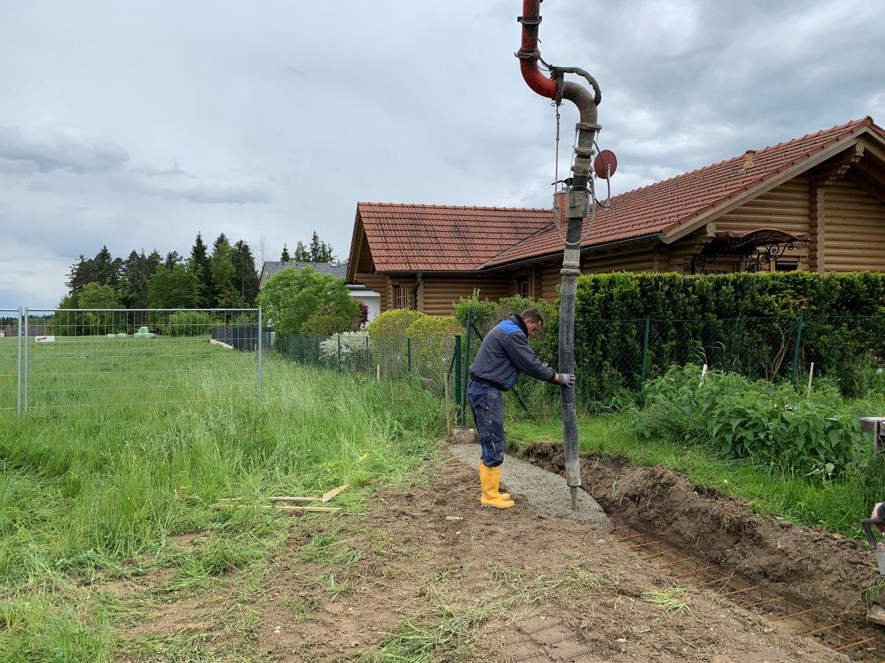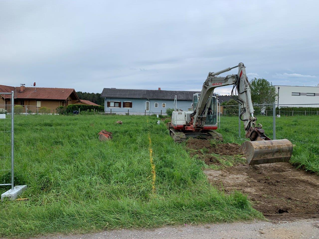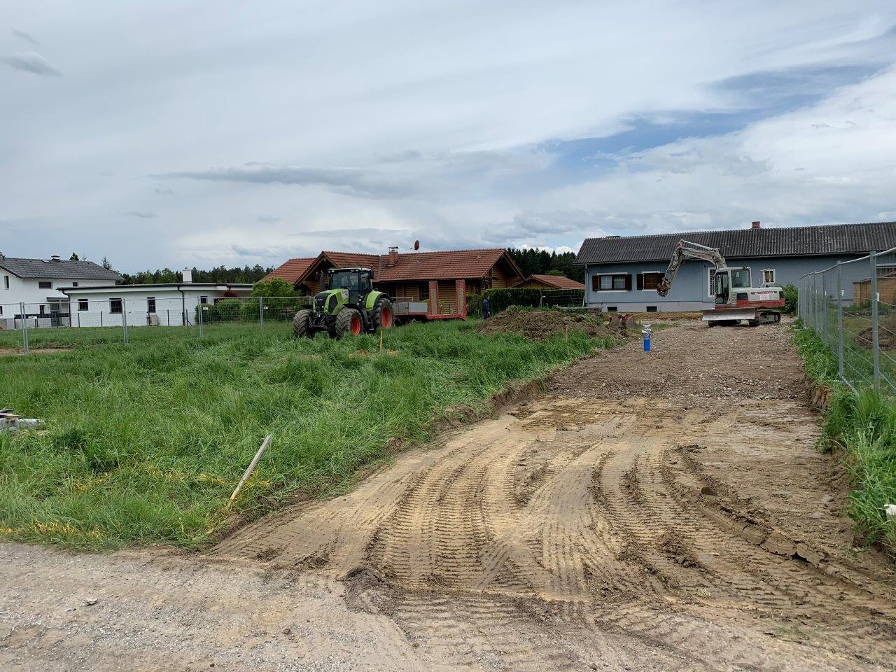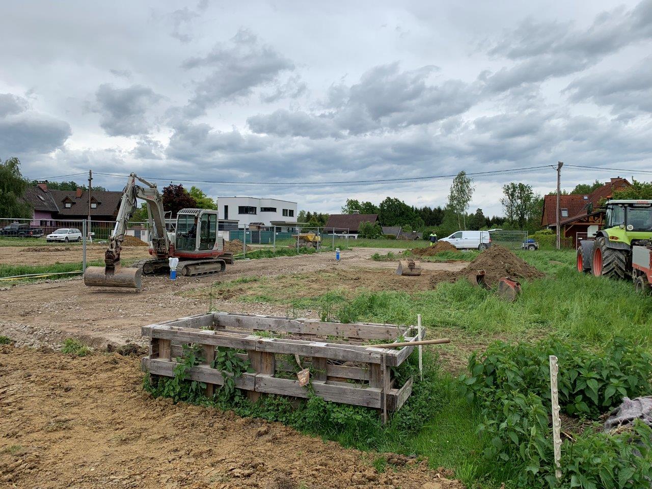 Nachdem uns das Wetter, wie so oft, durch die heftigen Regenfälle einen Strich durch die Rechnung gemacht hat, und somit der Baubeginn im Hofstättenweg zurückverlegt werden musste, konnten wir inzwischen zumindest die Einfahrt schottern, den Baustrom und das Bauwasser installieren sowie den ersten Zaunsockel betonieren.