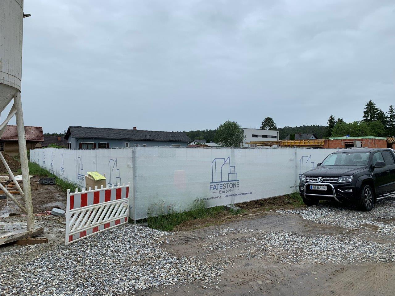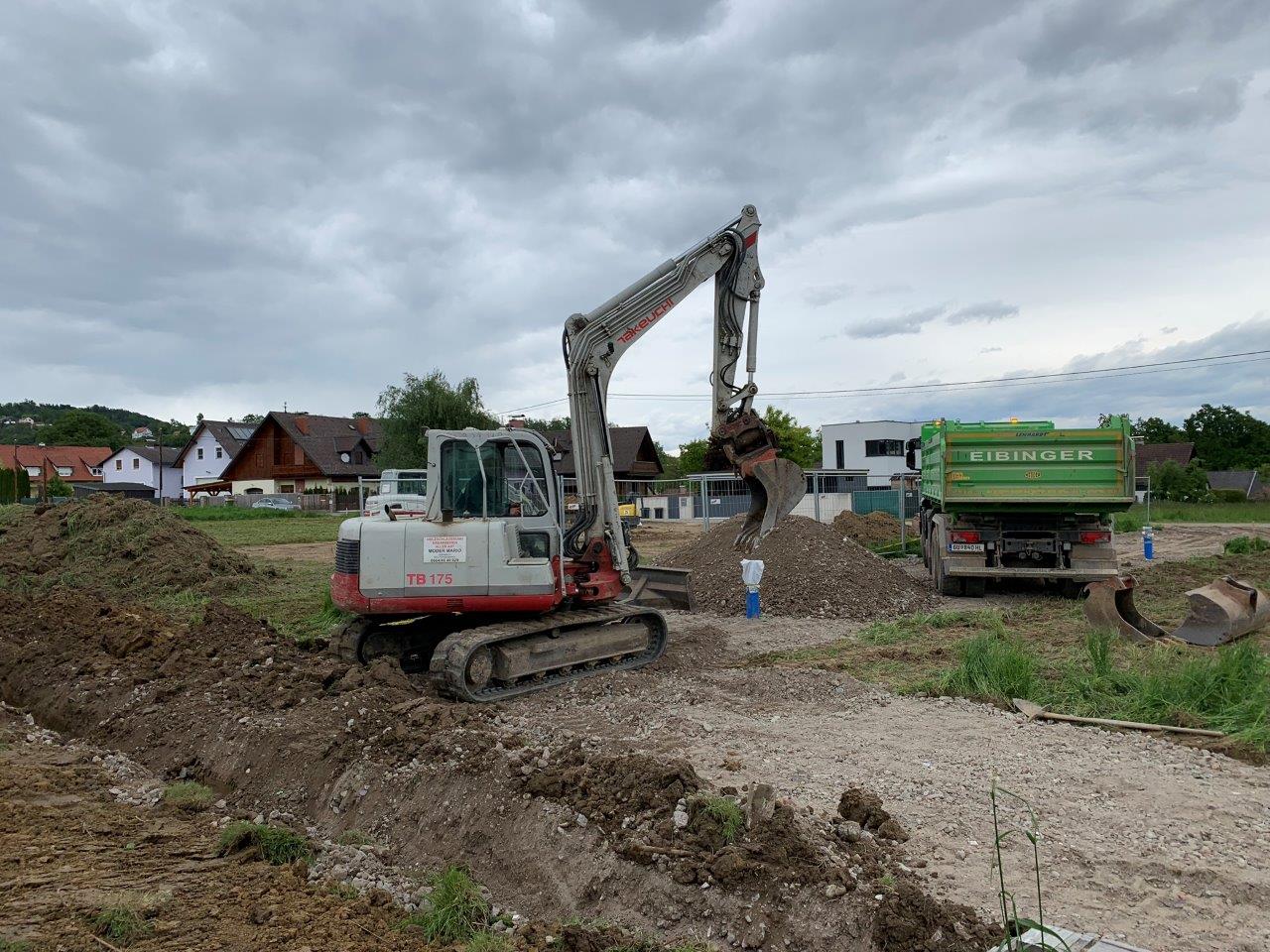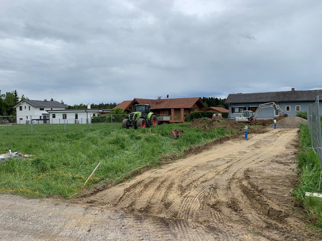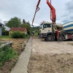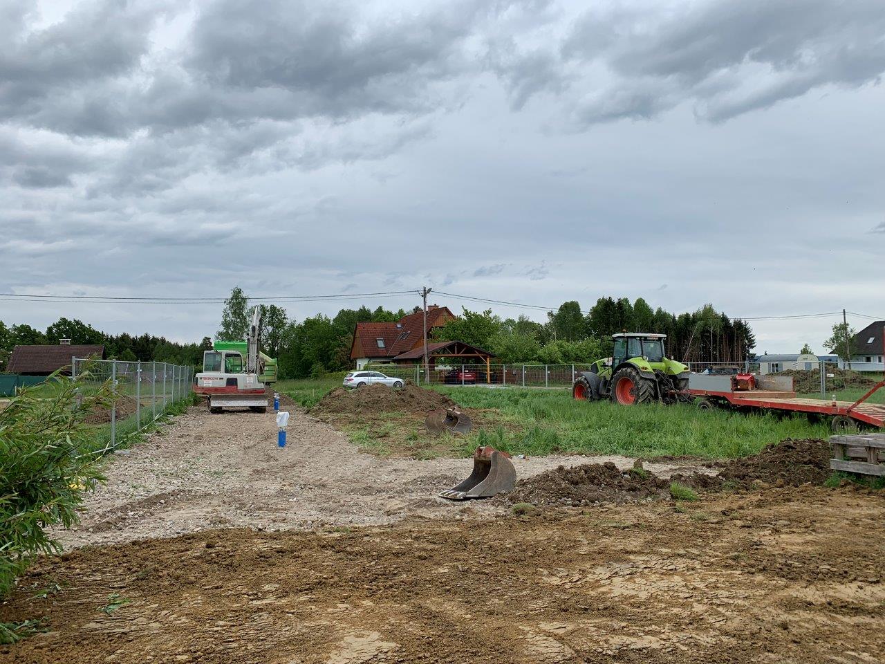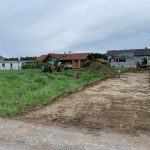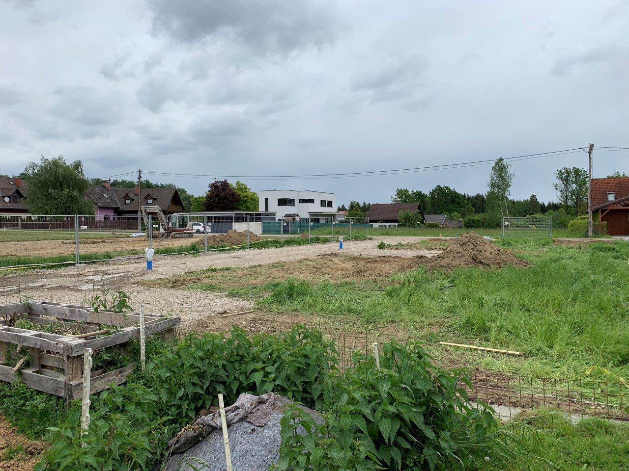 Nachdem uns das Wetter, wie so oft, durch die heftigen Regenfälle einen Strich durch die Rechnung gemacht hat, und somit der Baubeginn im Hofstättenweg zurückverlegt werden musste, konnten wir inzwischen zumindest die Einfahrt schottern, den Baustrom und das Bauwasser installieren sowie den ersten Zaunsockel betonieren.