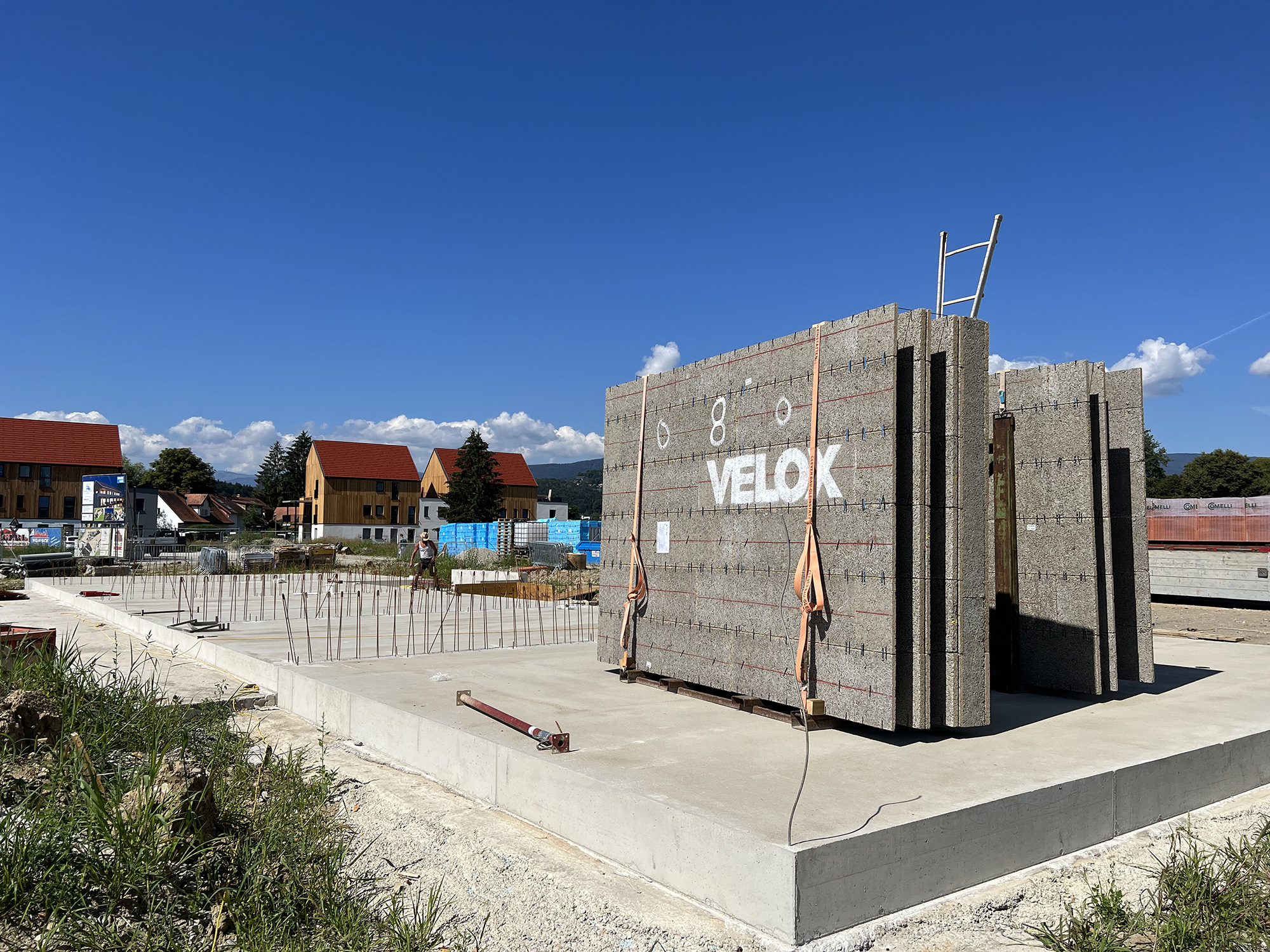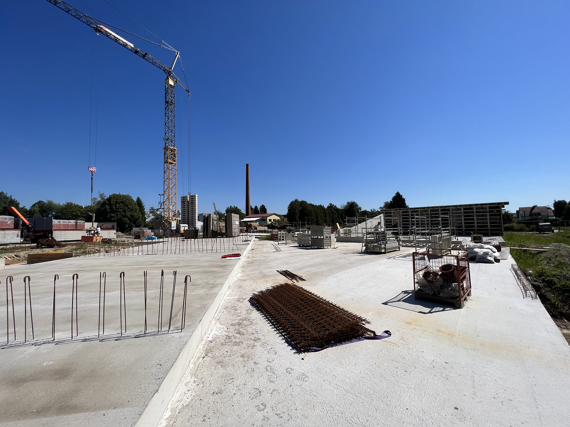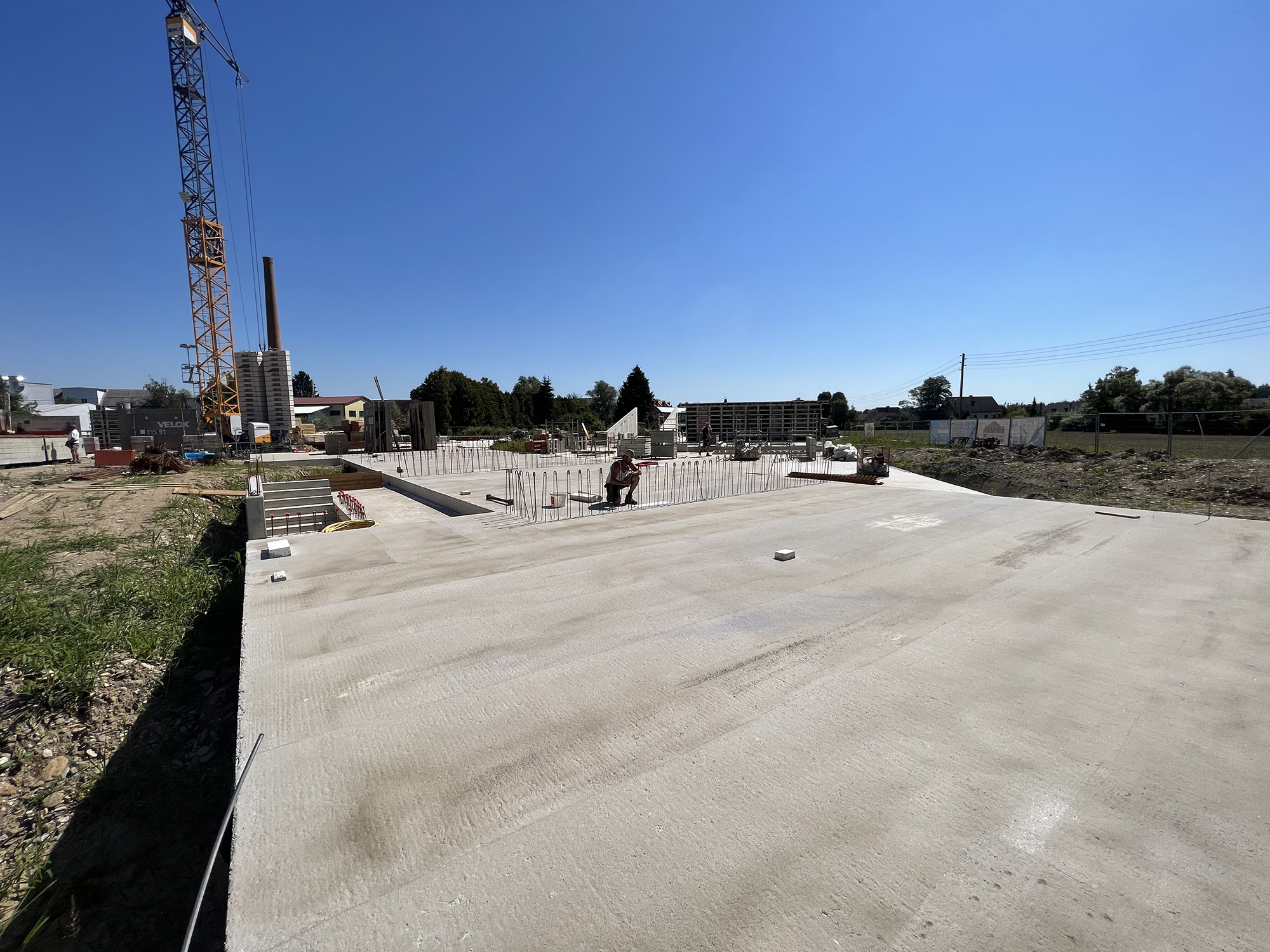 Nachdem nun die Tiefgarage von allen Seiten zugeschüttet wurde, hat sich die Baufirma Kiegerl an die Herstellung der Bodenplatten über der Tiefgarage fokussiert. Diese wurden nun auch für die Häuser A, B, C und D fertiggestellt, wodurch das Aufmauern beginnen kann. Die Bodenplatte für das Haus E wird zu einem späteren Zeitpunkt hergestellt, da dieses Haus als letztes entstehen wird.
