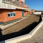 Aber auch im Außenbereich waren wir sehr fleißig, denn da hat sich auch ziemlich viel getan. Durch die betonierten Zaunsockel und die erforderlichen Stützwände haben wir nicht nur die Vorlage für den Zaun erschaffen, sondern auch die Gartenaufteilungen für die jeweiligen Wohnungen im Erdgeschoss vollbracht. Die Gartenflächen haben wir wieder mit dem Mutterboden befüllt und die erste Runde Rasensamen gleichmäßig verstreut. Darüber hinaus steht auch schon der gemeinsame Müllabstellplatz, der nur noch überdacht werden und verputzt werden muss.